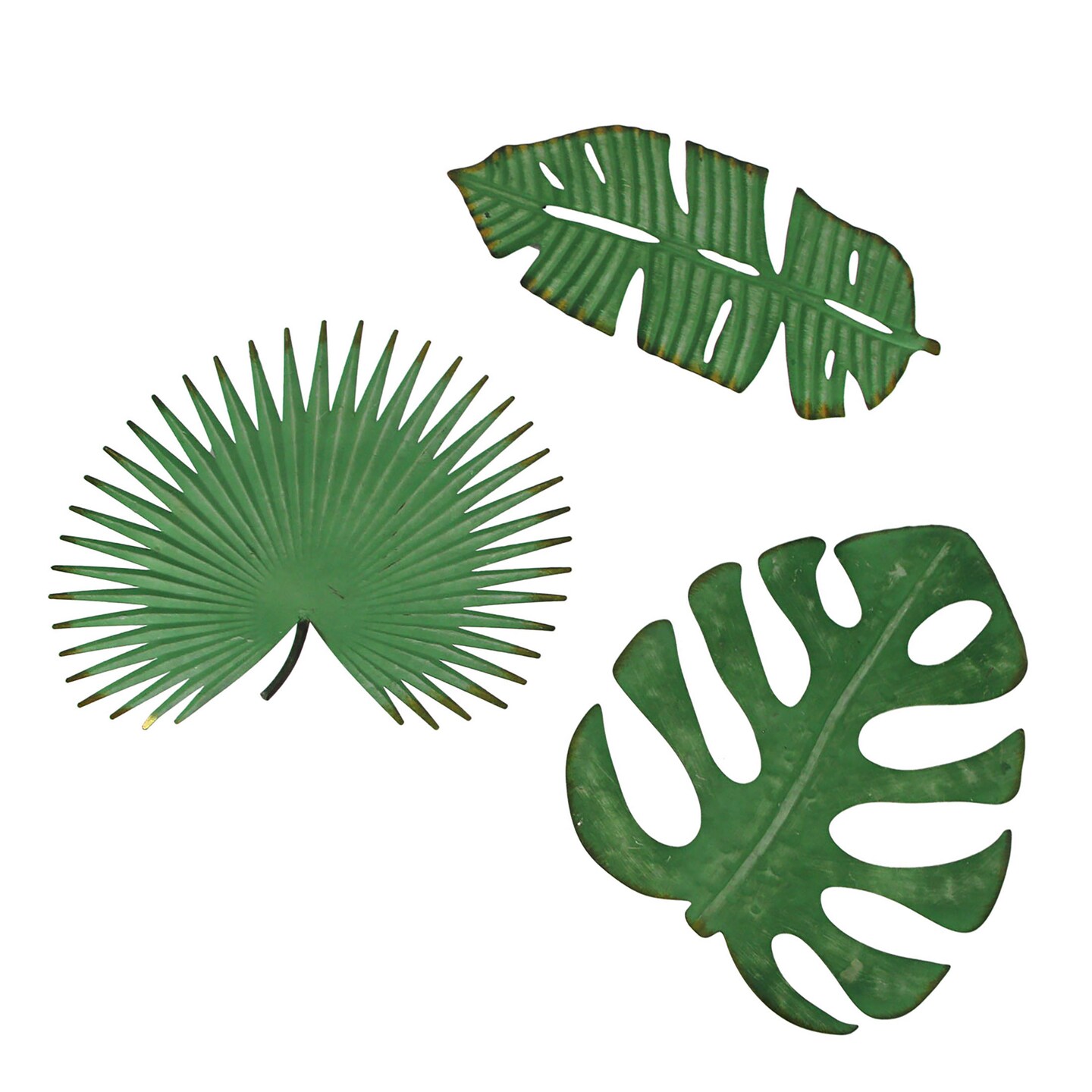 Set / 3 Antiqued Green Metal Tropical Leaf Wall Hanging Palmetto Monstera Banana