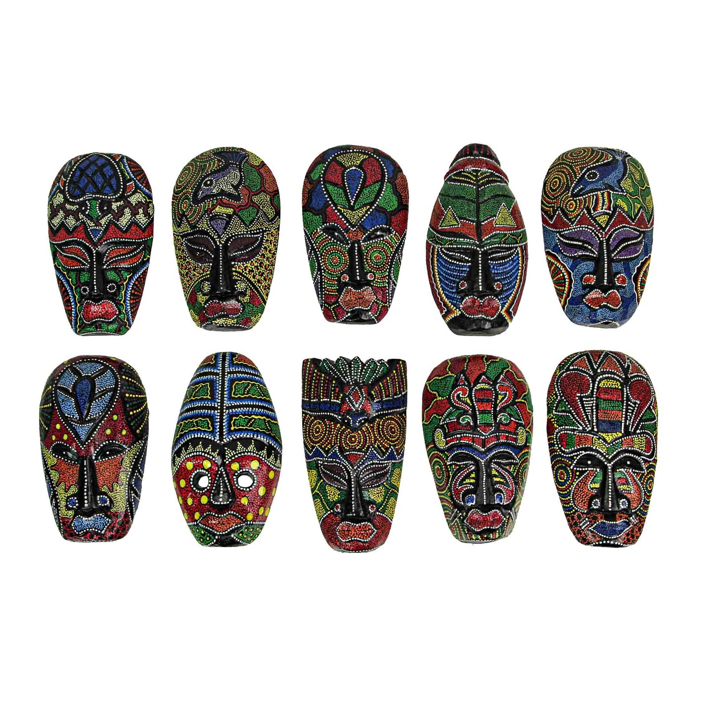 Set of 10 Hand Carved Tropical Dot Painted Tribal Masks 6 Inch Wall Decor