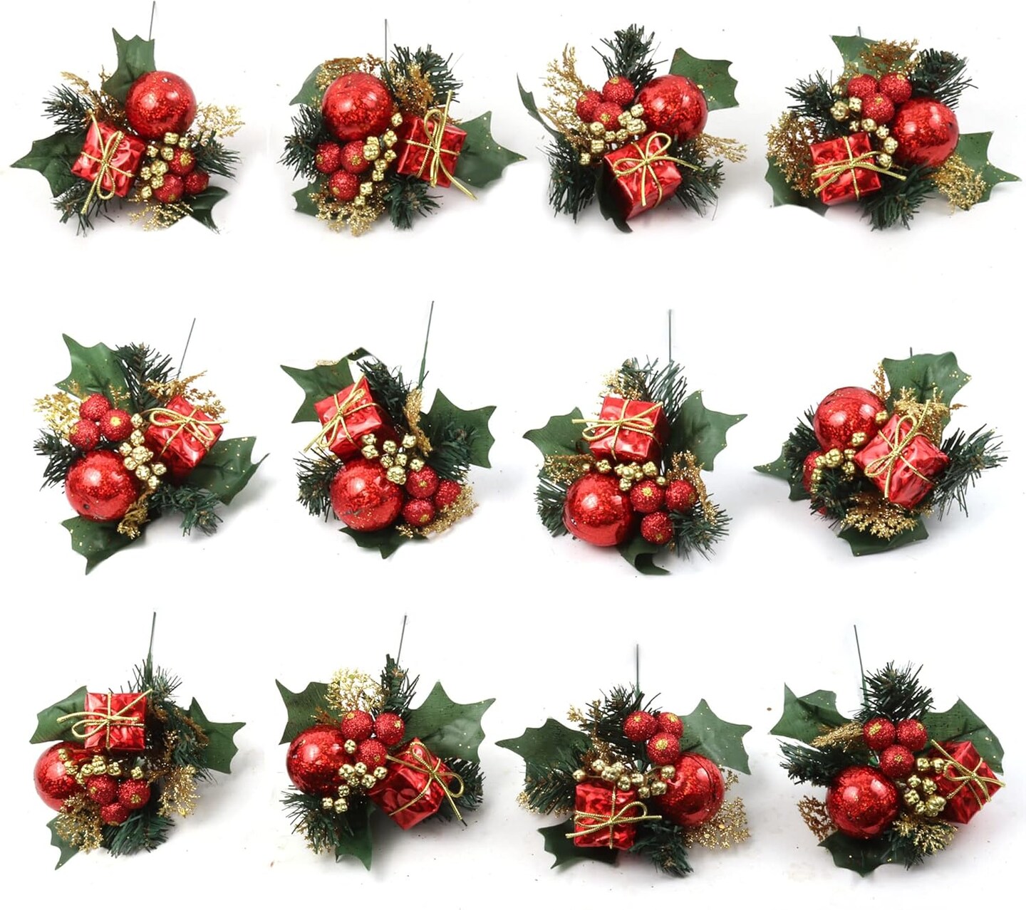 Set of 12 Red and Gold Holly Christmas Picks, Festive Decor for Trees, Wreaths & Gift Wrapping - 2024 Christmas Collection, Floral Home by Artificial Flowers