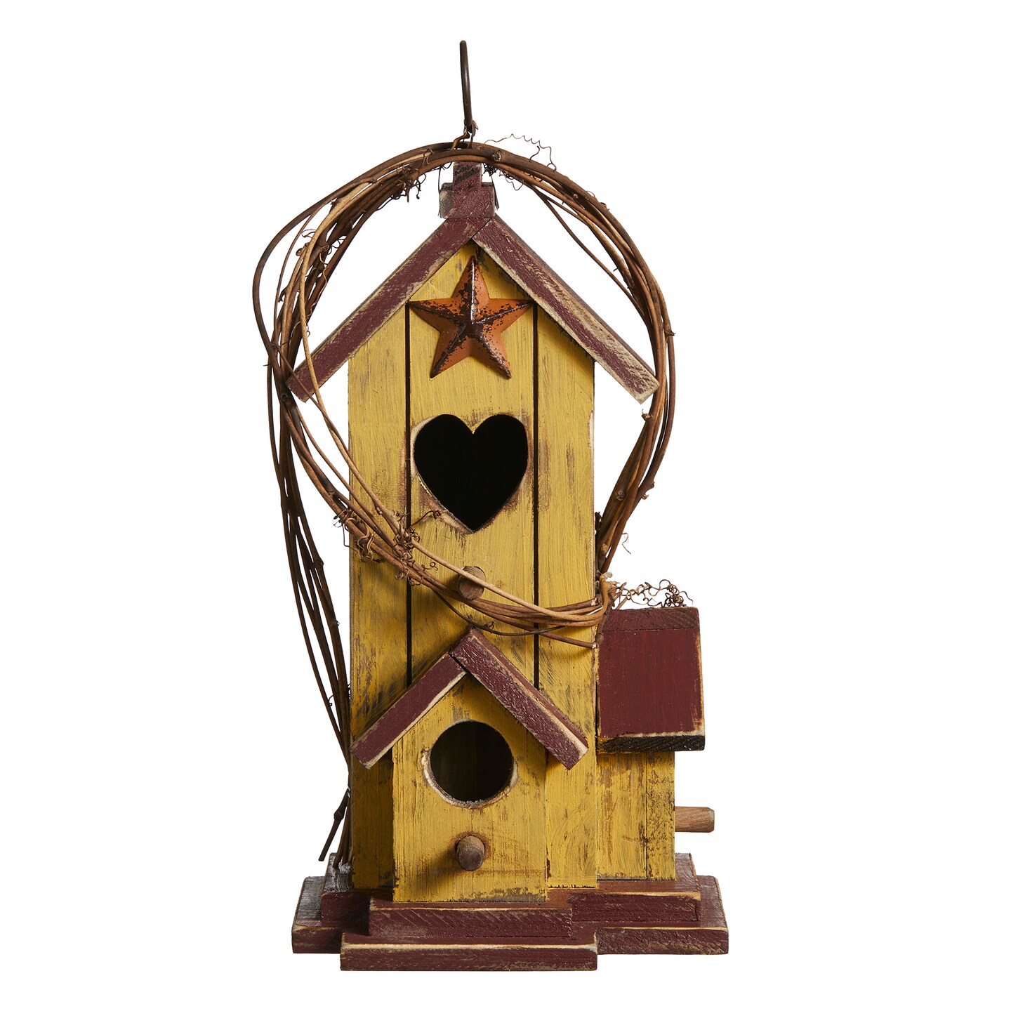 Set of 2 11.5"H Washed Yellow Distressed Solid Wood Cottage Decorative Outdoor Garden Birdhouse with Rattan