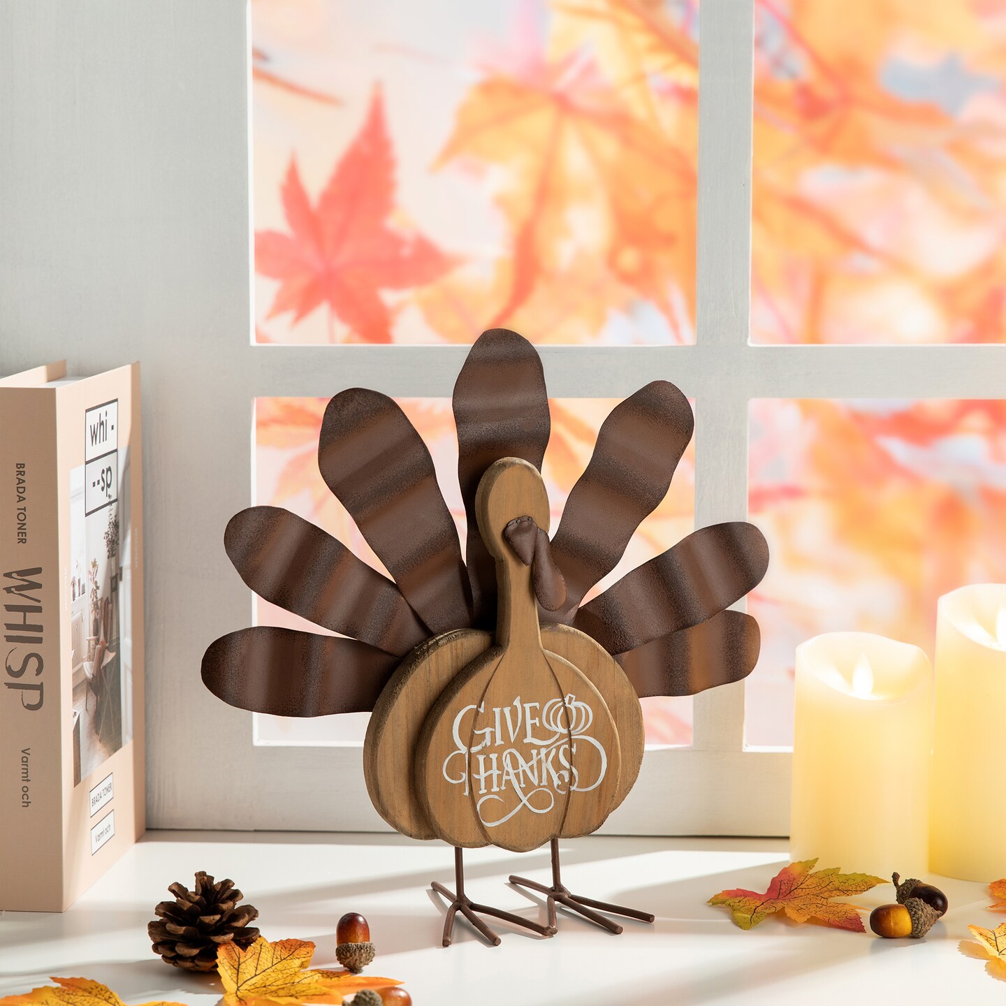 Set of 2 12.25"L Thanksgiving Wooden & Metal Turkey Table Decor