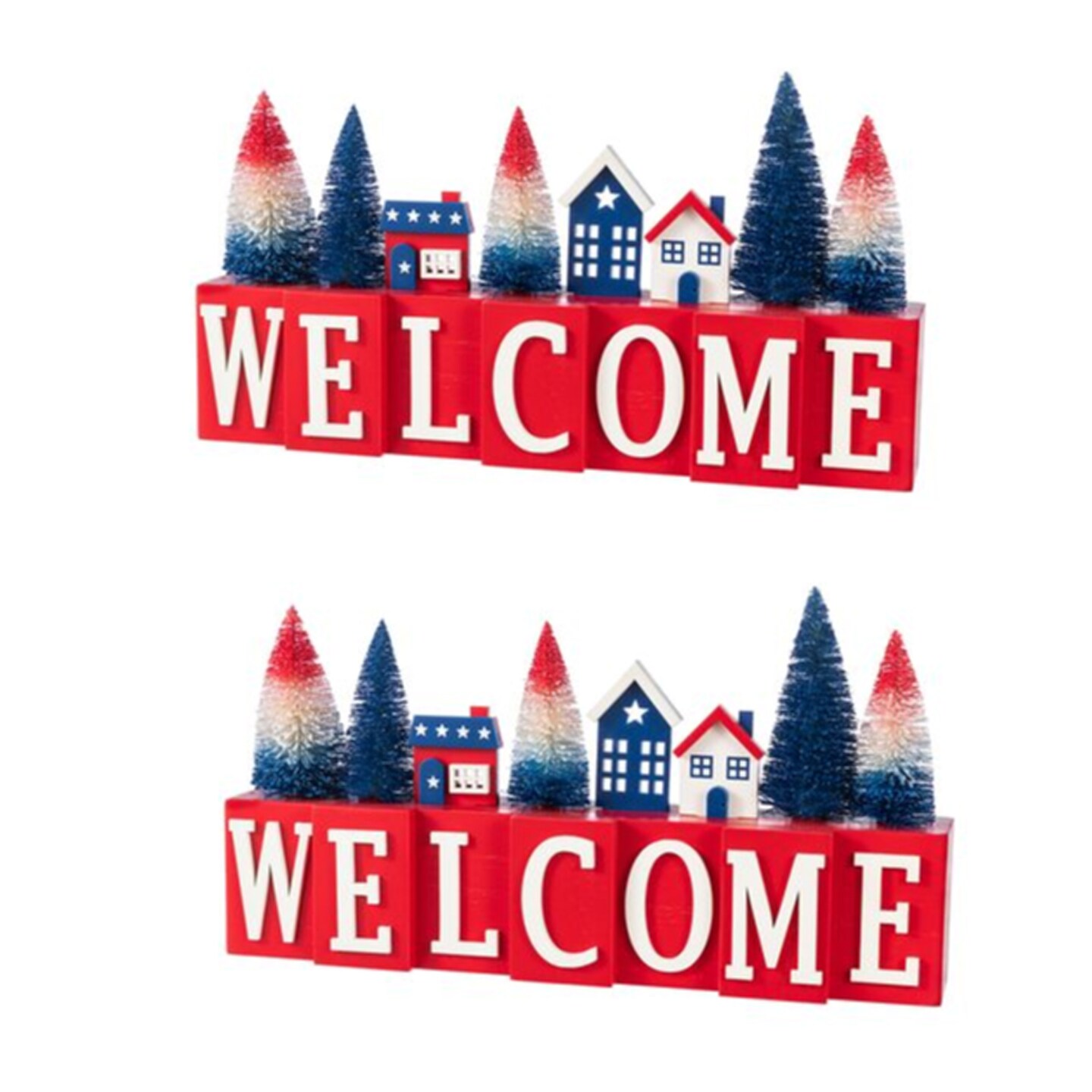 Set of 2 14''L Patriotic/ Americana Wooden House/Brush Trees Table Décor
