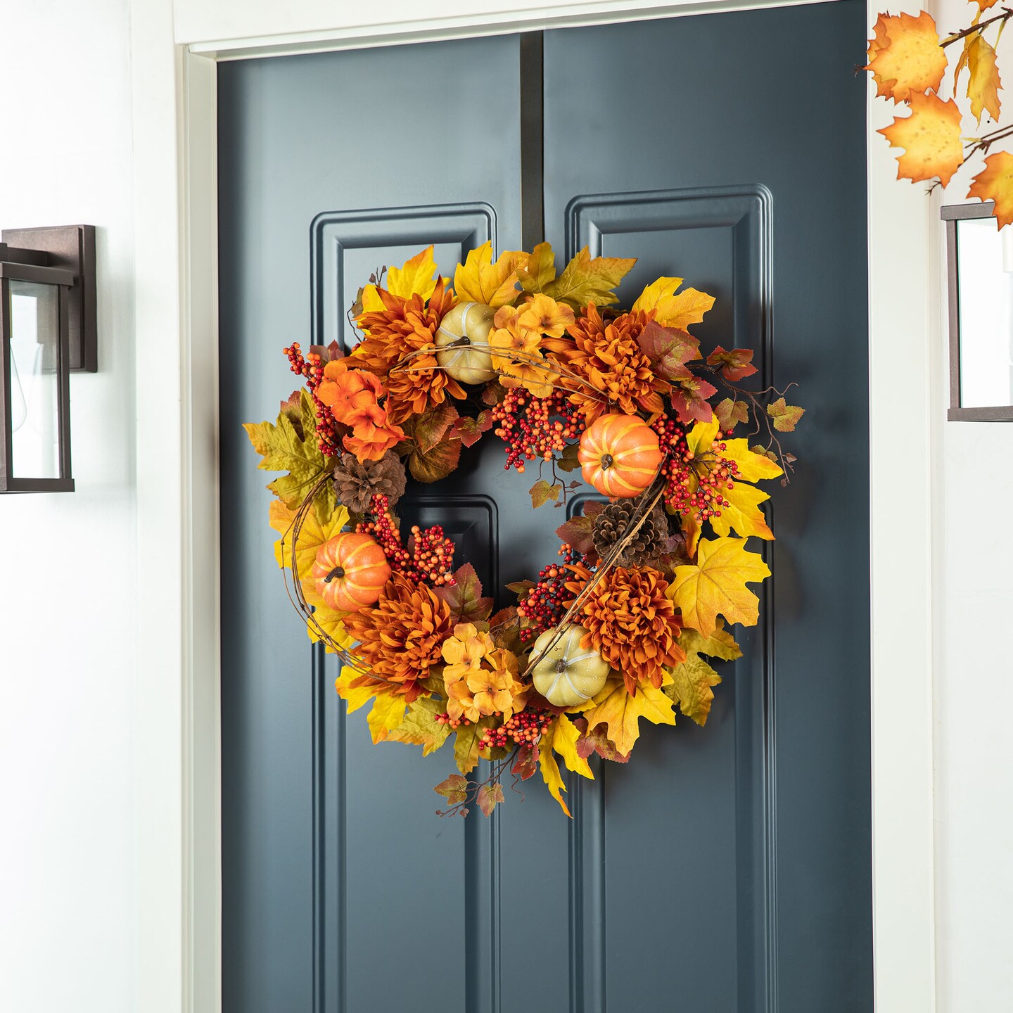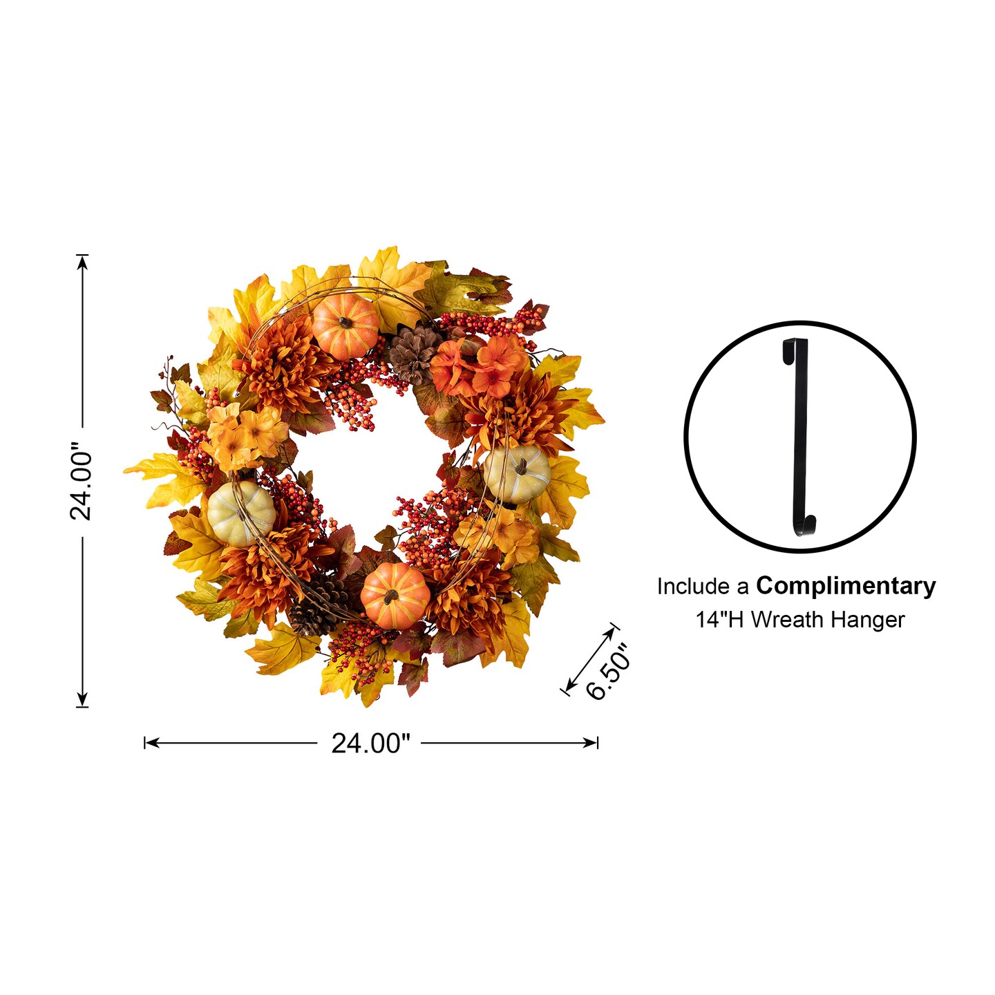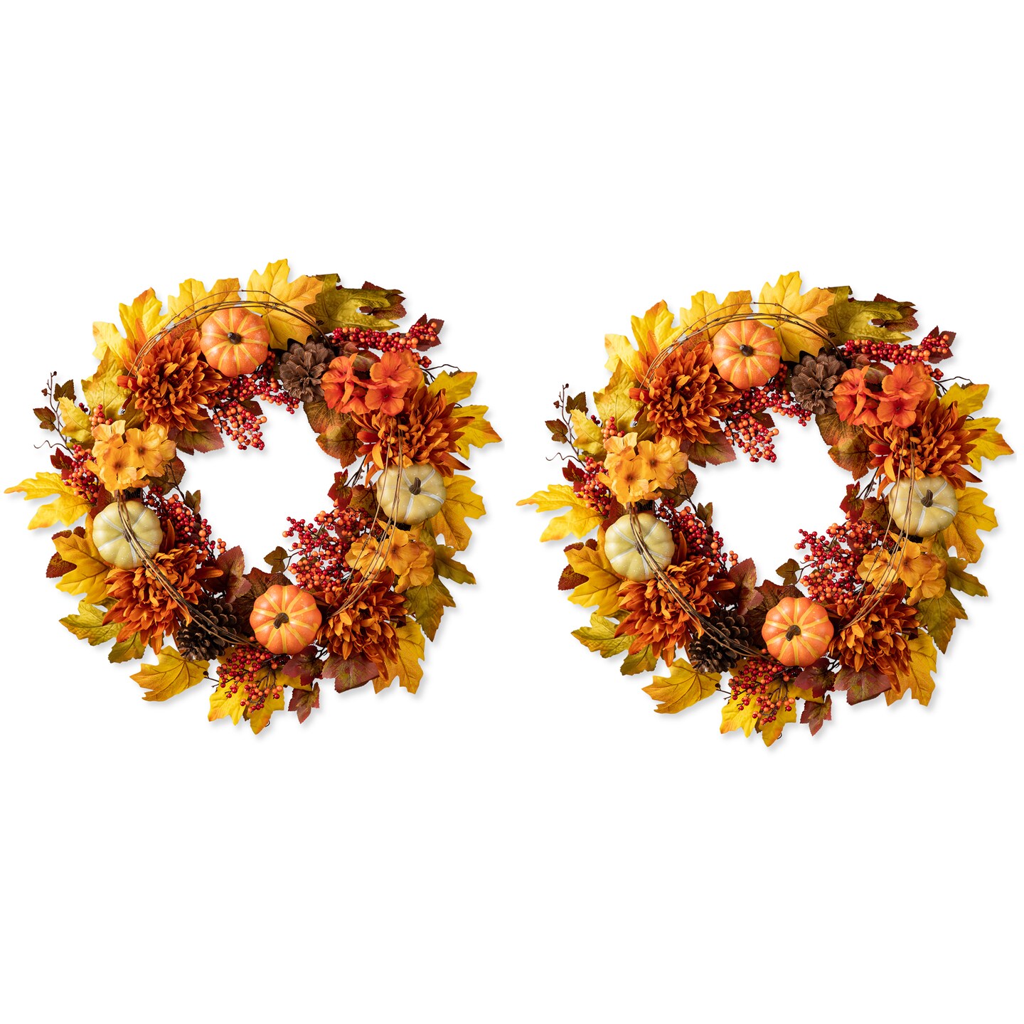 Set of 2 24"D Fall Dahlia Pumpkin, Leaf and Berry Wreath Includes a Complimentary Black Metal Wreath Hanger