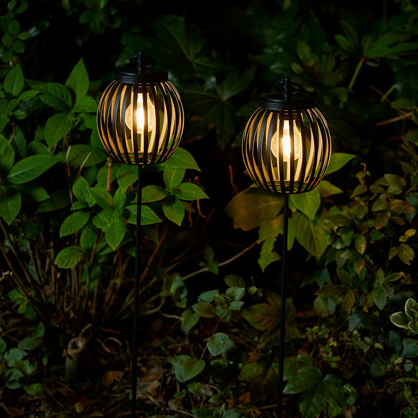 Set of 2 32.25"H Black Metal Stripes Solar Powered Outdoor Lantern with Edison Bulb and Stake