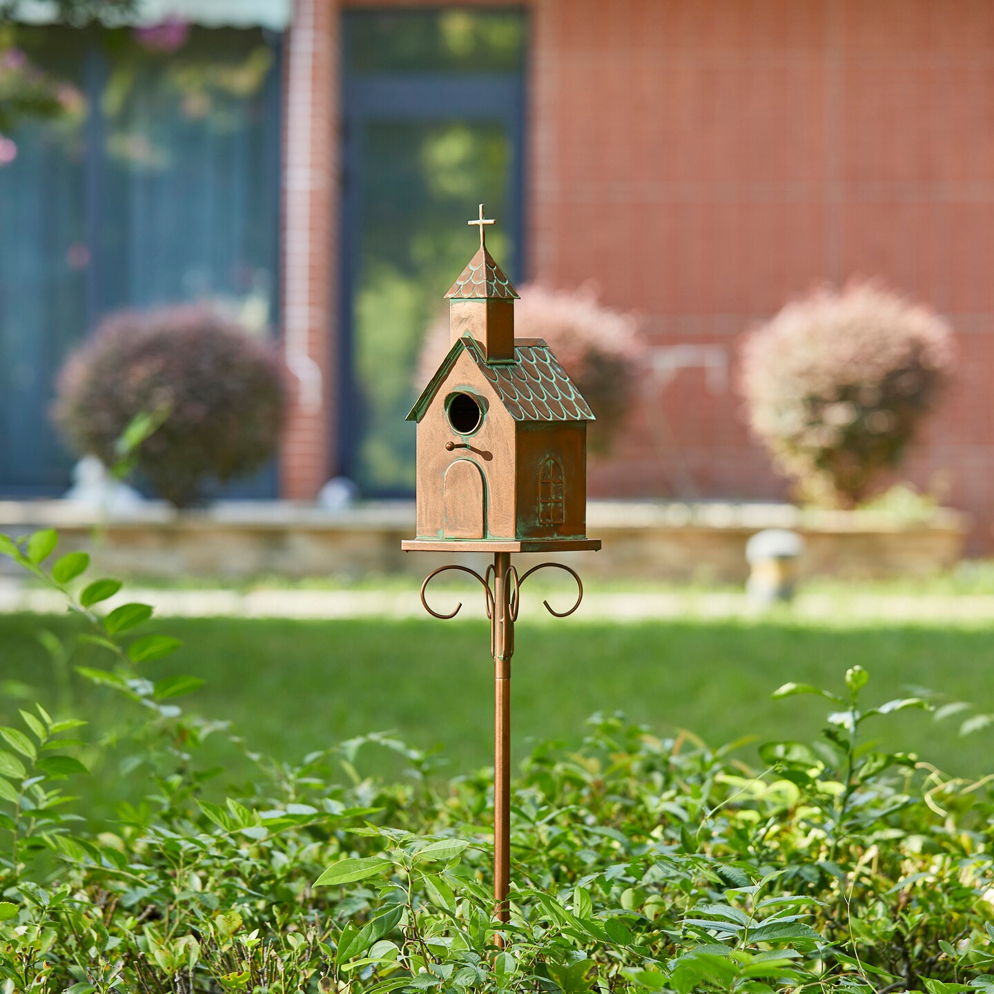 Set of 2 53.00''H Farmhouse Faux Copper Distressed Metal Church Outdoor Decorative Garden Birdhouse with Stake