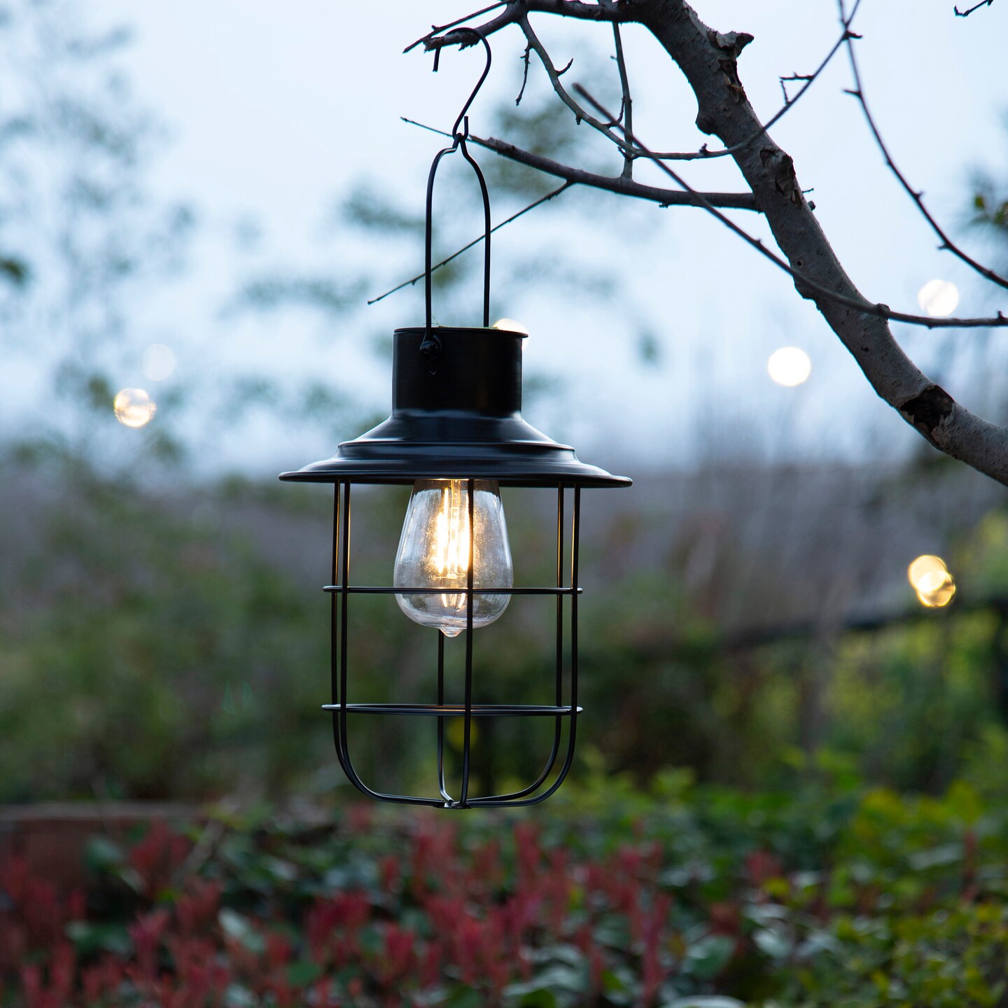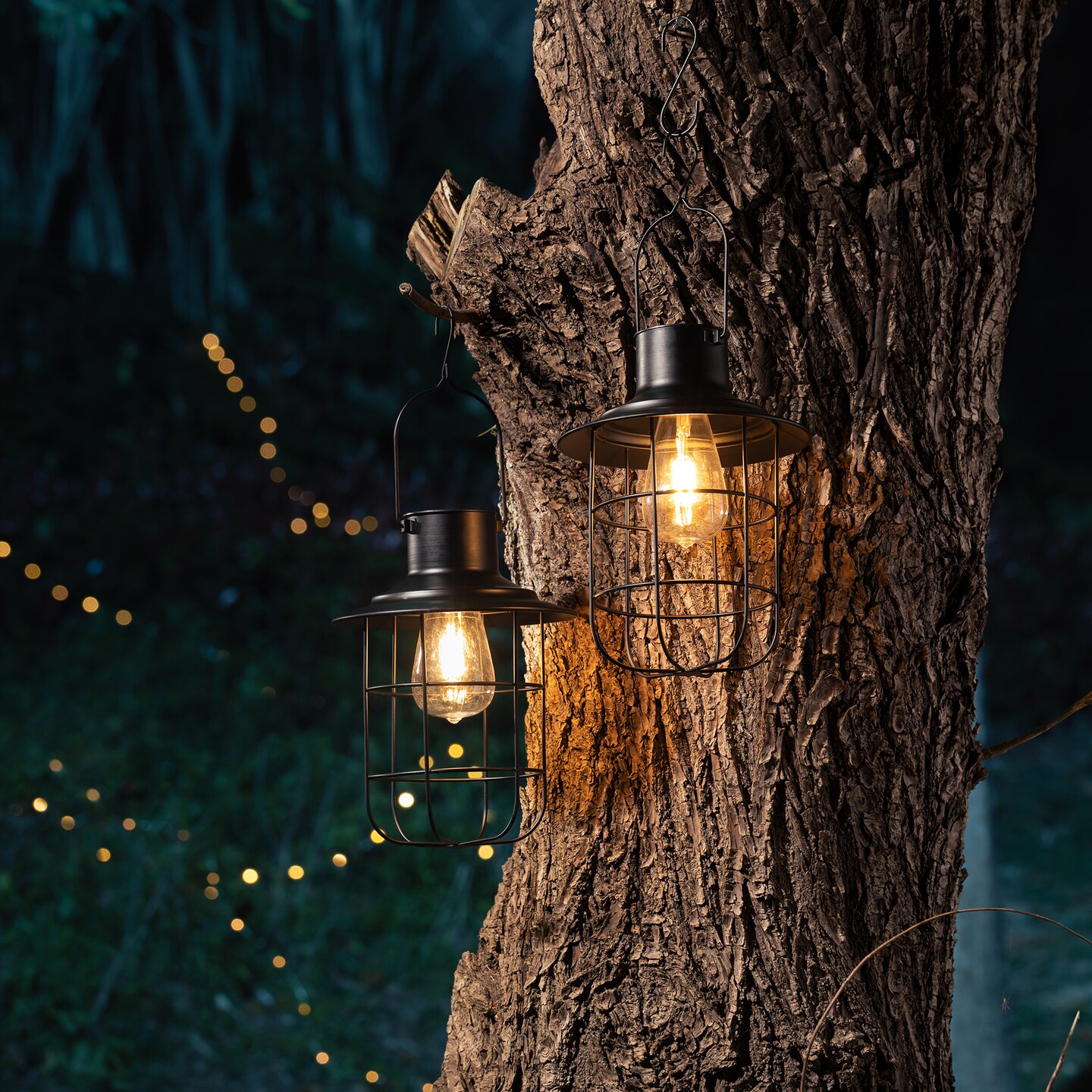 Set of 2 9.75"H Industrial-Style Black Metal Wire Solar Powered Edison Bulb Outdoor Hanging Lantern
