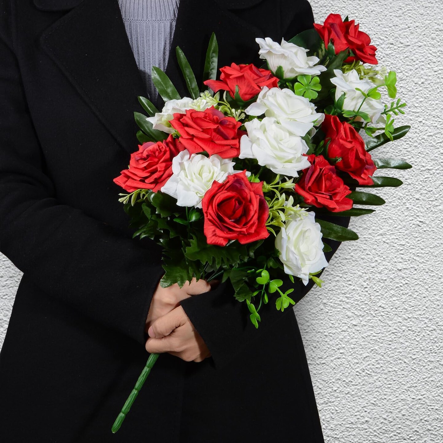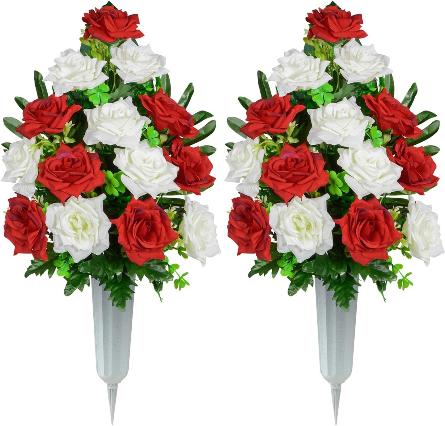 Set of 2 Artificial Cemetery Flowers – Memorial Rose Bouquets with Vases for Grave, Cemetery & Headstone Decoration (Red & White)