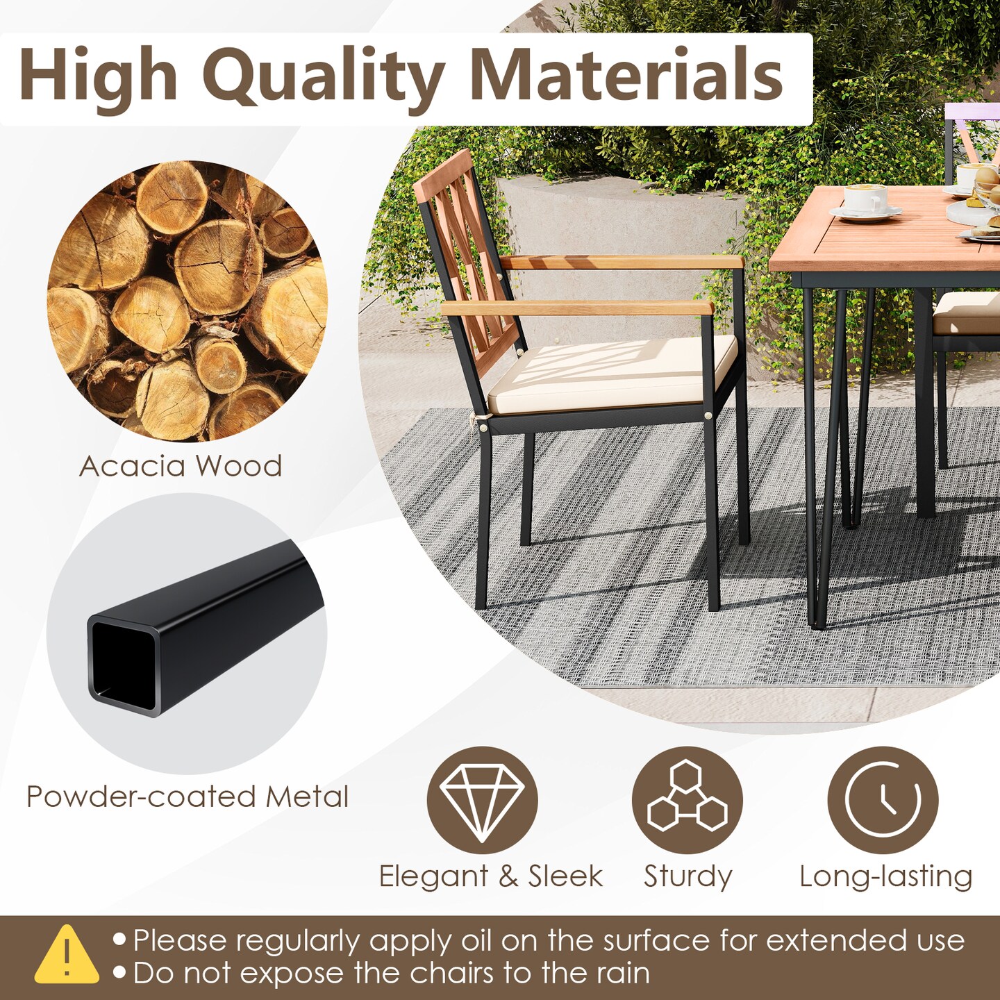Set of 2 Black Metal Acacia Wood Patio Dining Chairs with Cushioned Seats