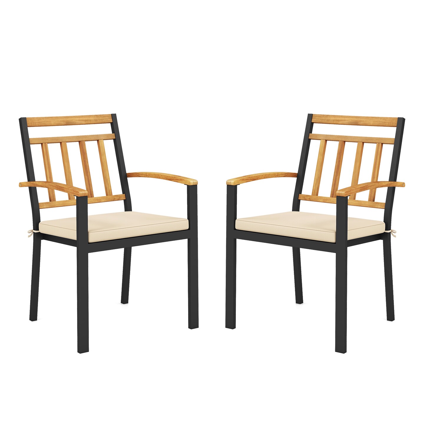 Set of 2 Black Metal Acacia Wood Patio Dining Chairs with Cushioned Seats