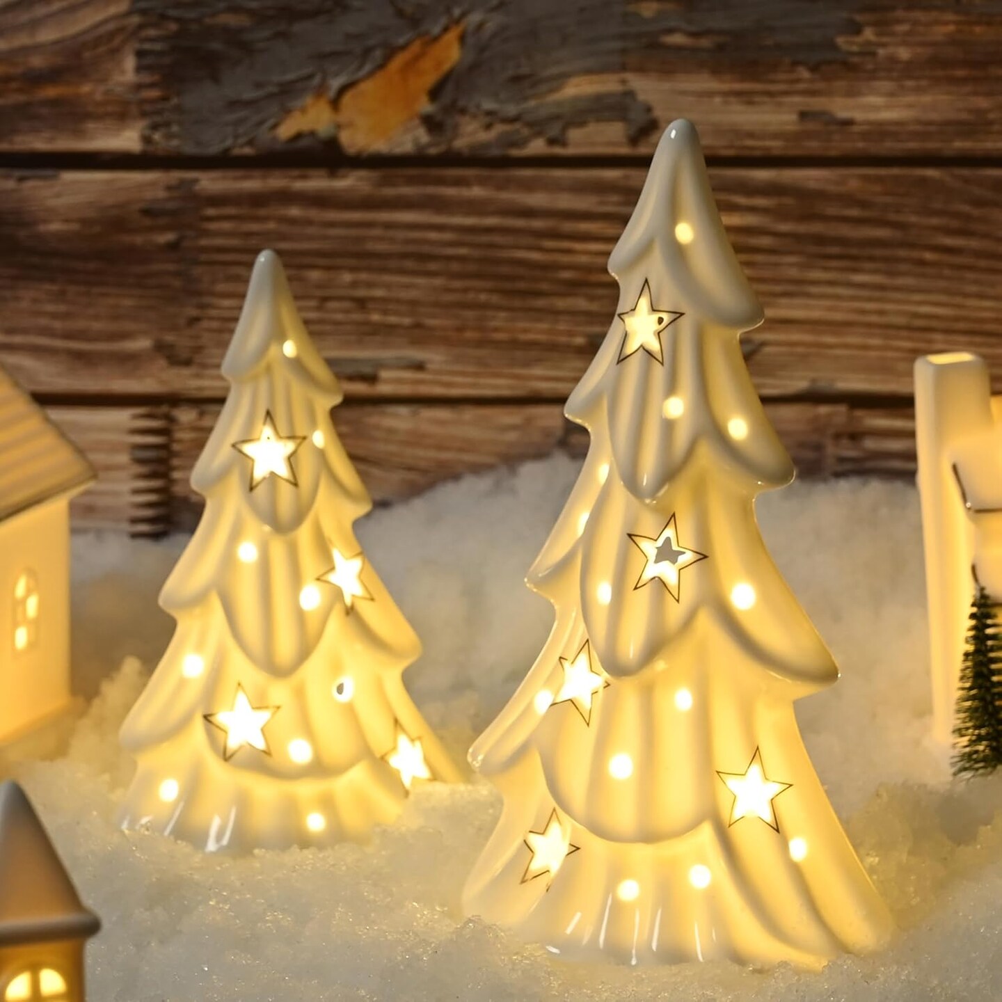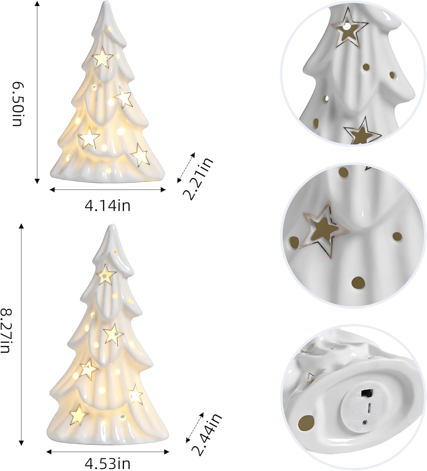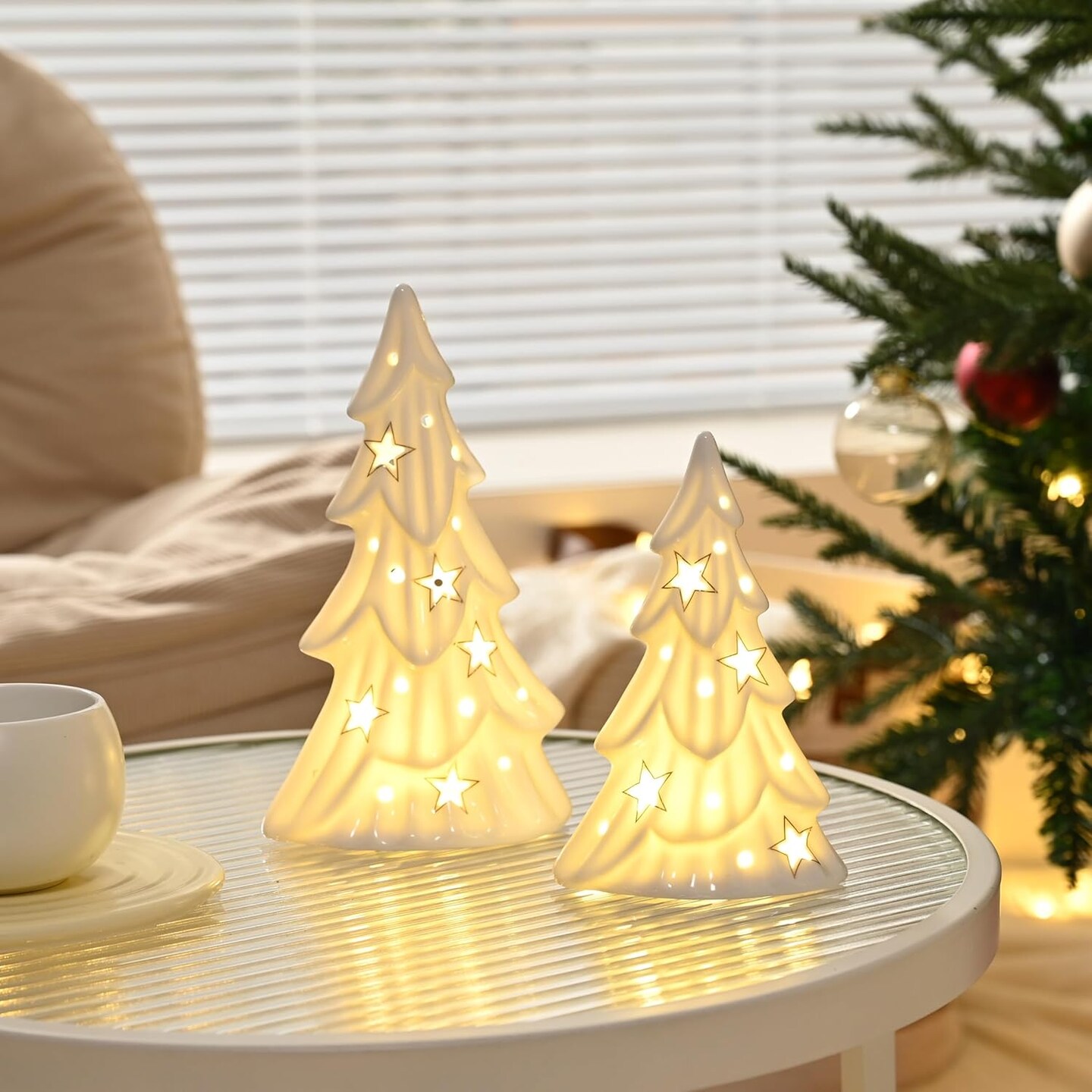 Set of 2 Ceramic Christmas Trees with Lights Tabletop Decor (Glossy White)