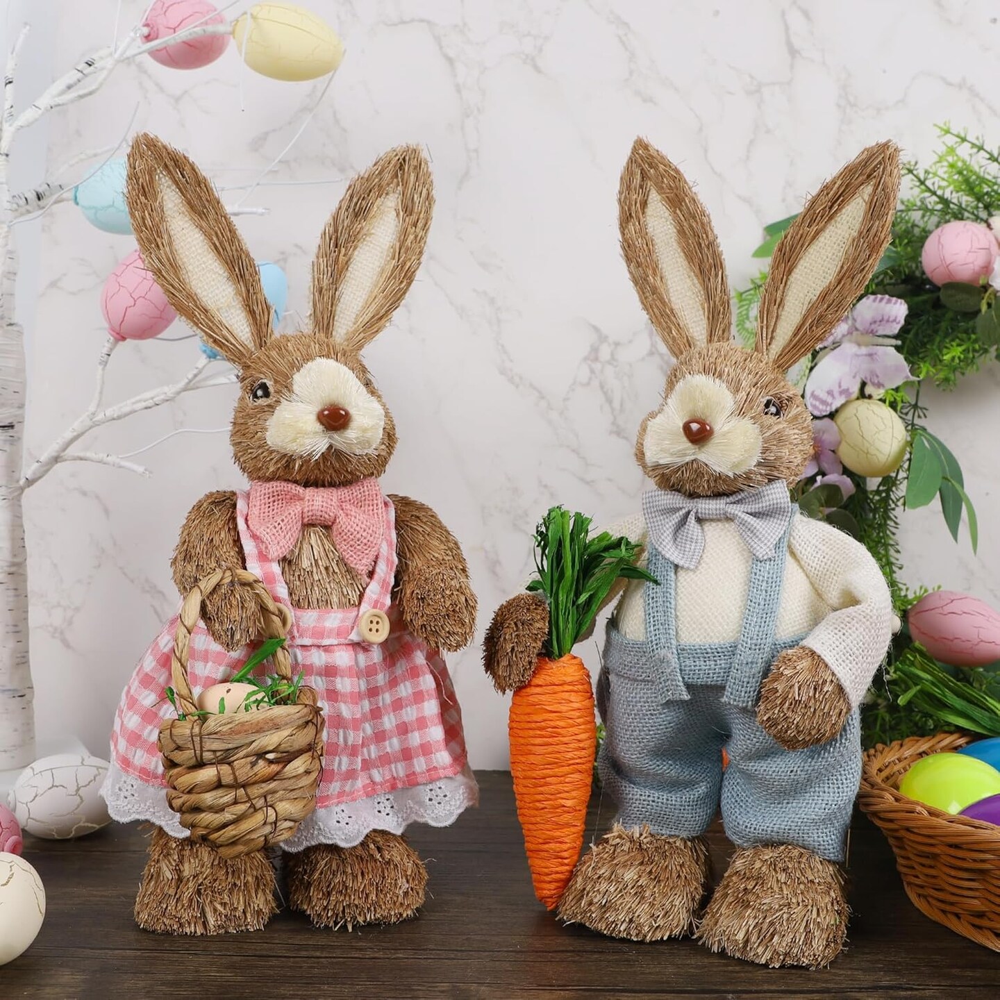 Set of 2 Easter Decorations Bunny, 14" Straw Bunny Figurine Tabletop Decor, Bunny Couple Statue with Carrot Eggs, Sisal Rabbits Spring Decor Centerpiece for Home Table Office Kitchen Farmhouse