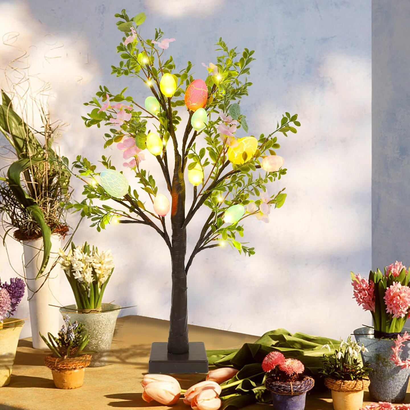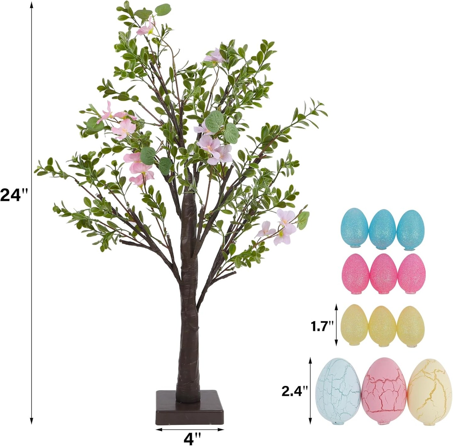 Set of 2 Lighted 24" Easter Trees – Artificial Tabletop Bonsai with Eggs & Colorful LED Lights