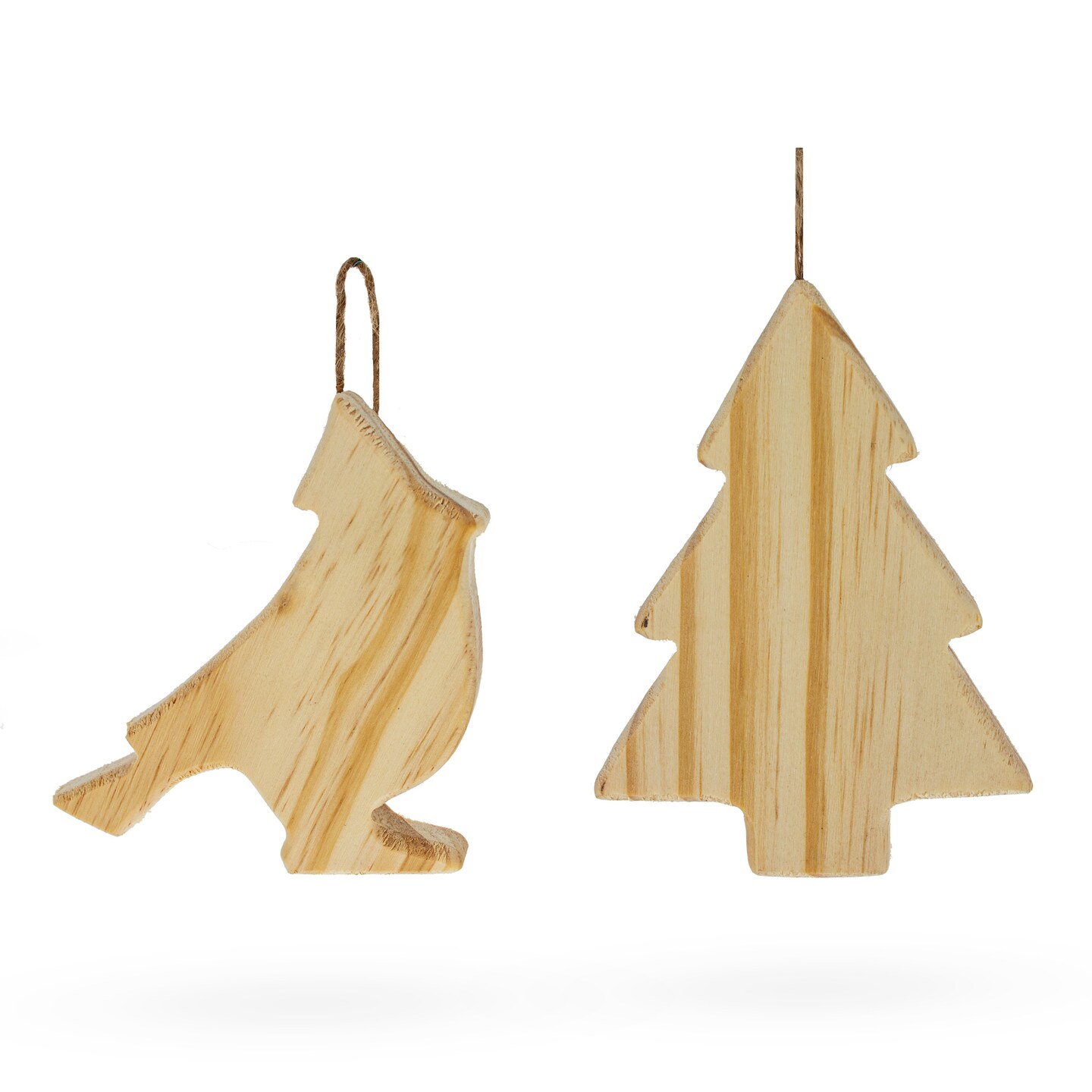 Set of 2 Unfinished Unpainted Wooden Bird and Christmas Tree Ornaments Cutouts DIY Craft 4.5 Inches