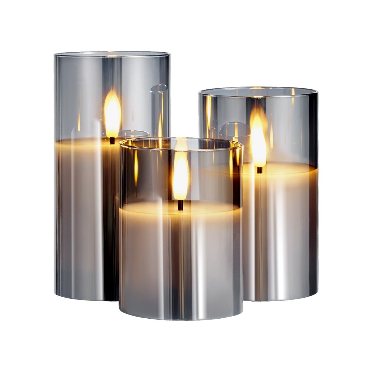 Set of 3 Grey Flickering Flameless LED Candles Battery Operated with Remote Timer Real Wax