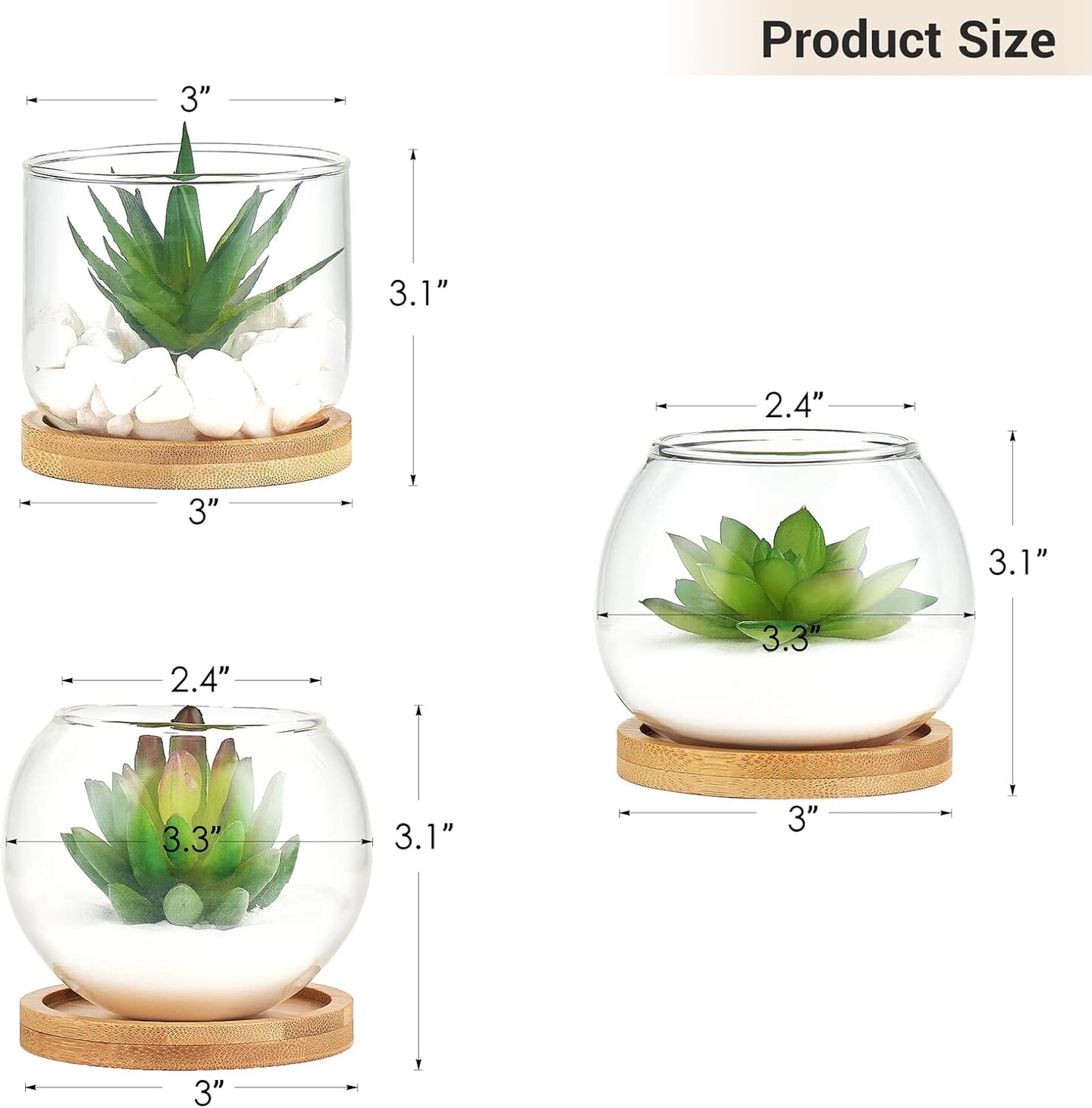 Set of 3 Mini Artificial Succulent Plants in Clear Glass Pots with Bamboo Tray – Realistic Faux Green Desk Plants for Home, Office, Bathroom, Kitchen & Tabletop Decor
