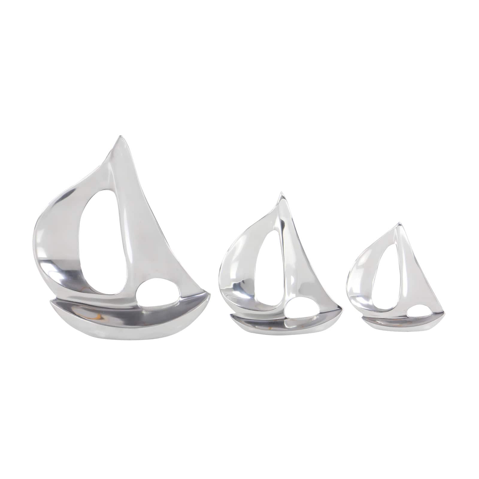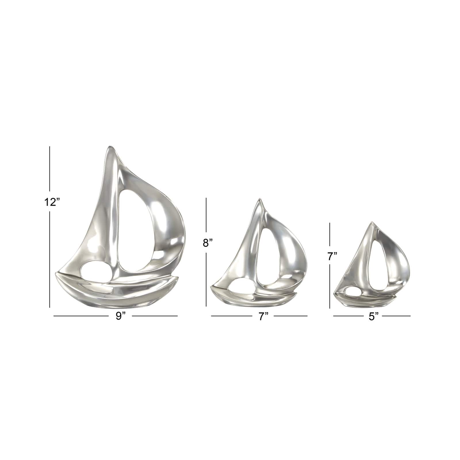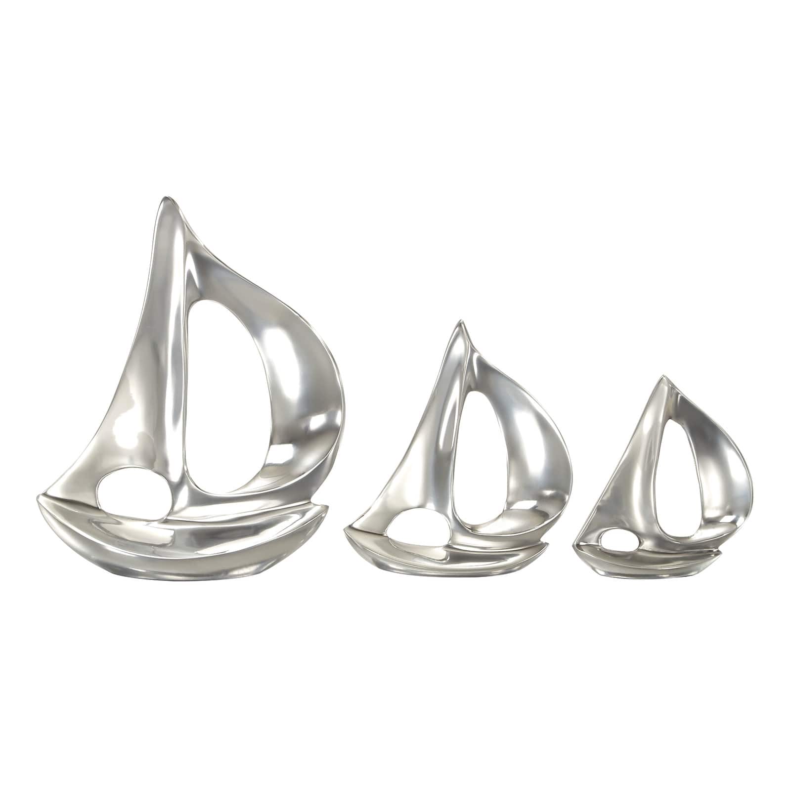 Set of 3 Silver Aluminum Coastal Sail Boat Sculpture, 12", 8", 7"