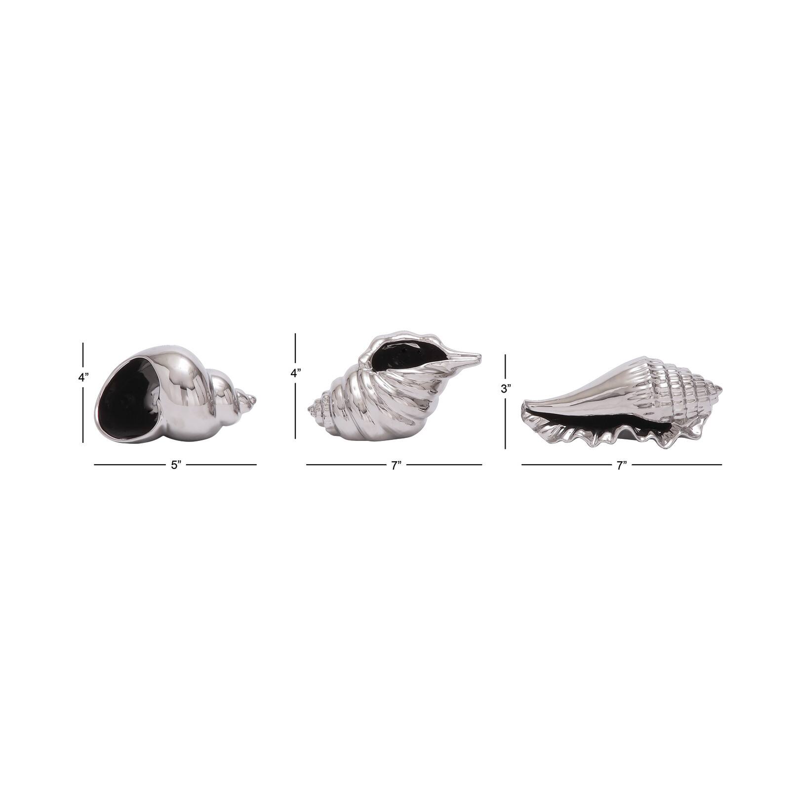 Set of 3 Silver Ceramic Coastal Shell Sculpture, 8", 7", 6"