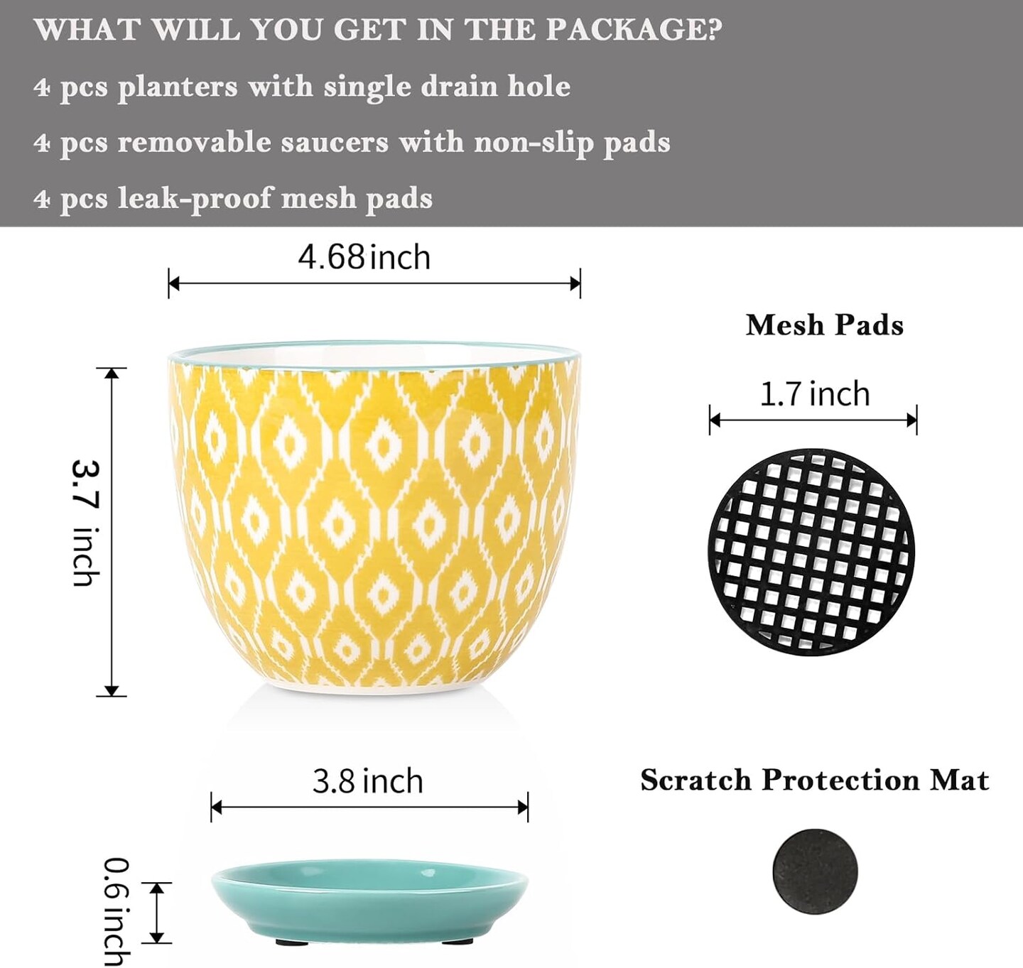 Set of 4 Ceramic Succulent Pots with Drainage Hole & Saucer - 4.6 Inch, Assorted Colors