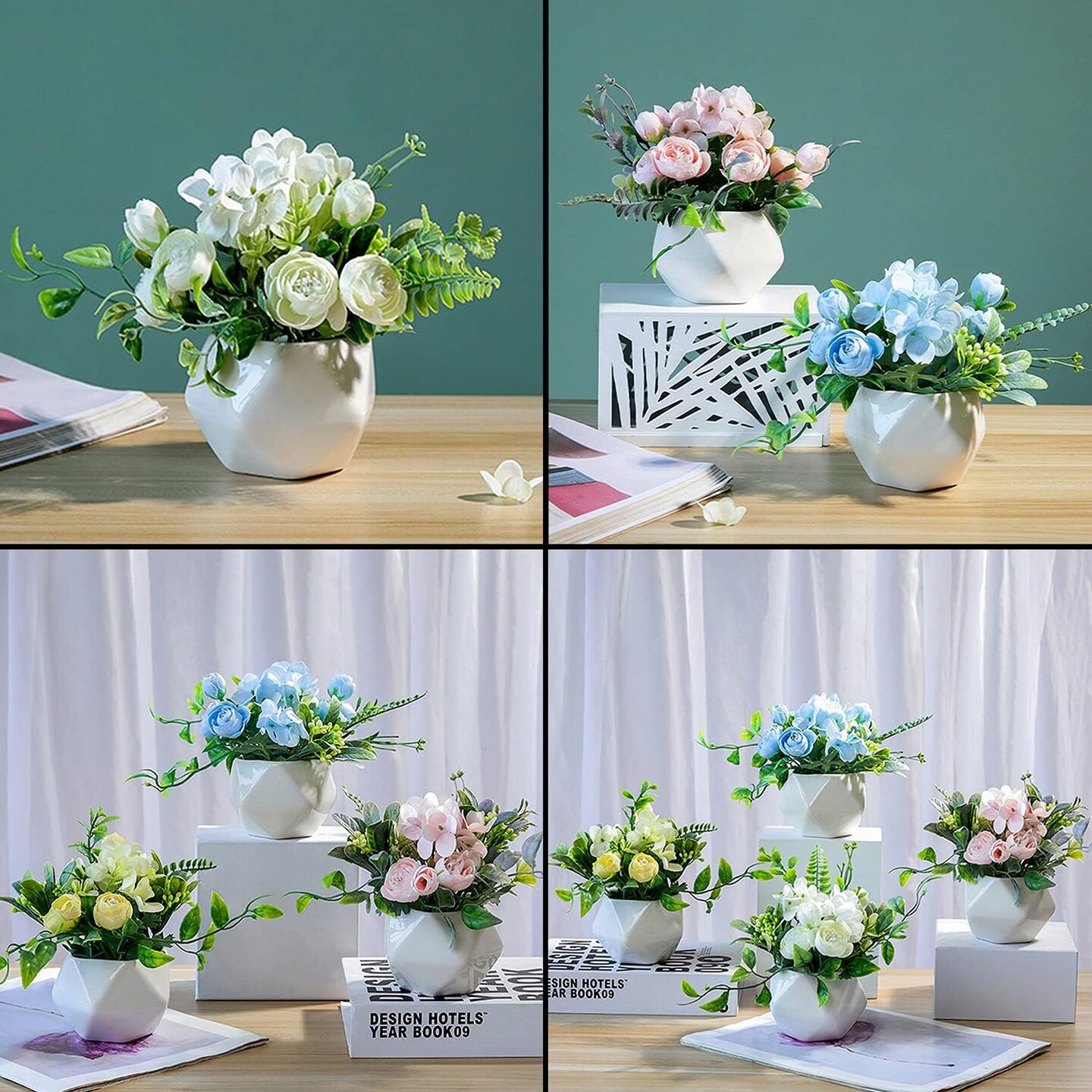 Set of 4 Mini Artificial Camellia Flowers in Ceramic Pots – Faux Floral Décor for Home & Office