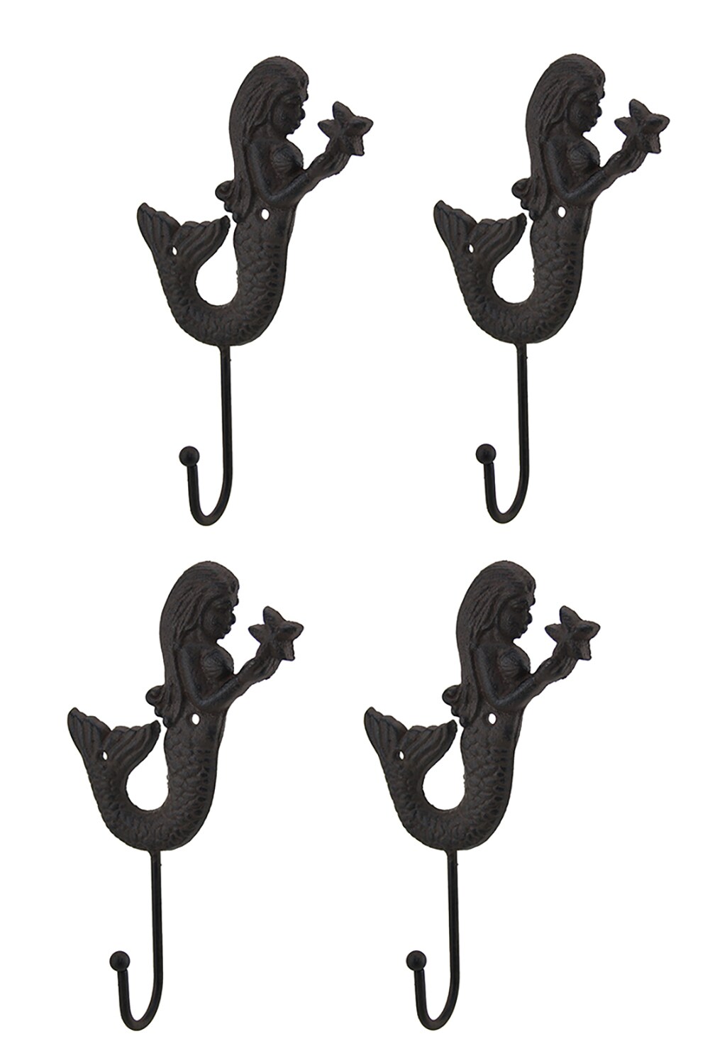 Set of 4 Rustic Brown Cast Iron Curved Tail Mermaid Wall Hooks