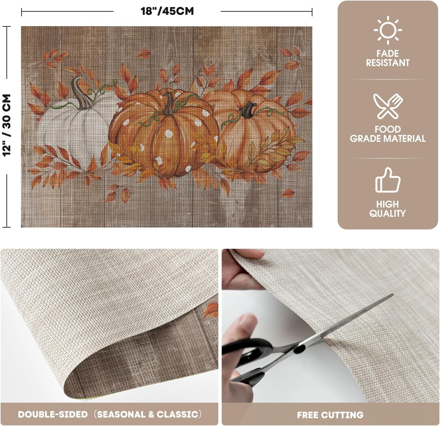 Set of 4 Wood Pumpkin Leaves Fall Vinyl Placemats - 12" x 18" (Orange)