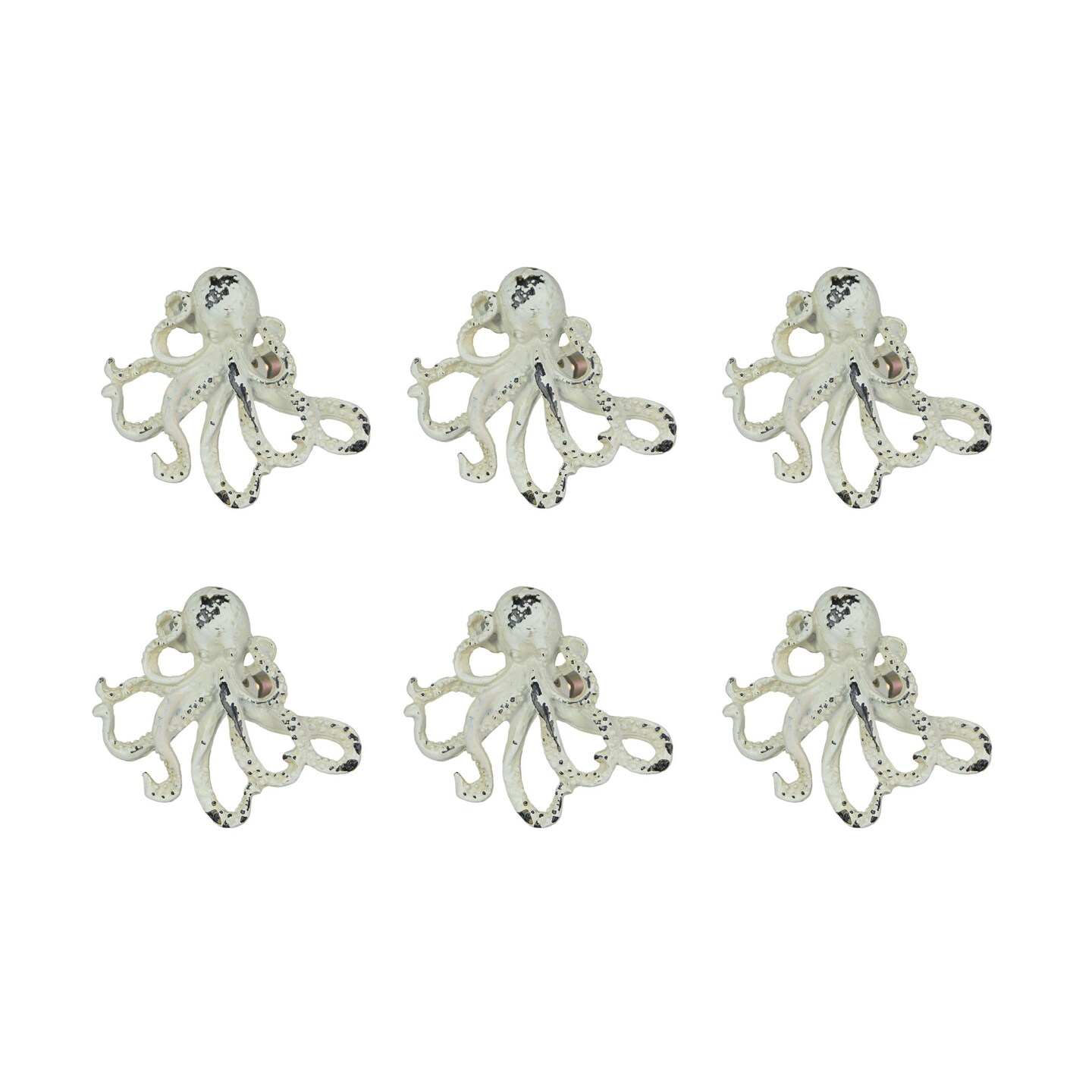 Set of 6 Distressed Finish Coastal White Cast Iron Octopus Drawer Pulls