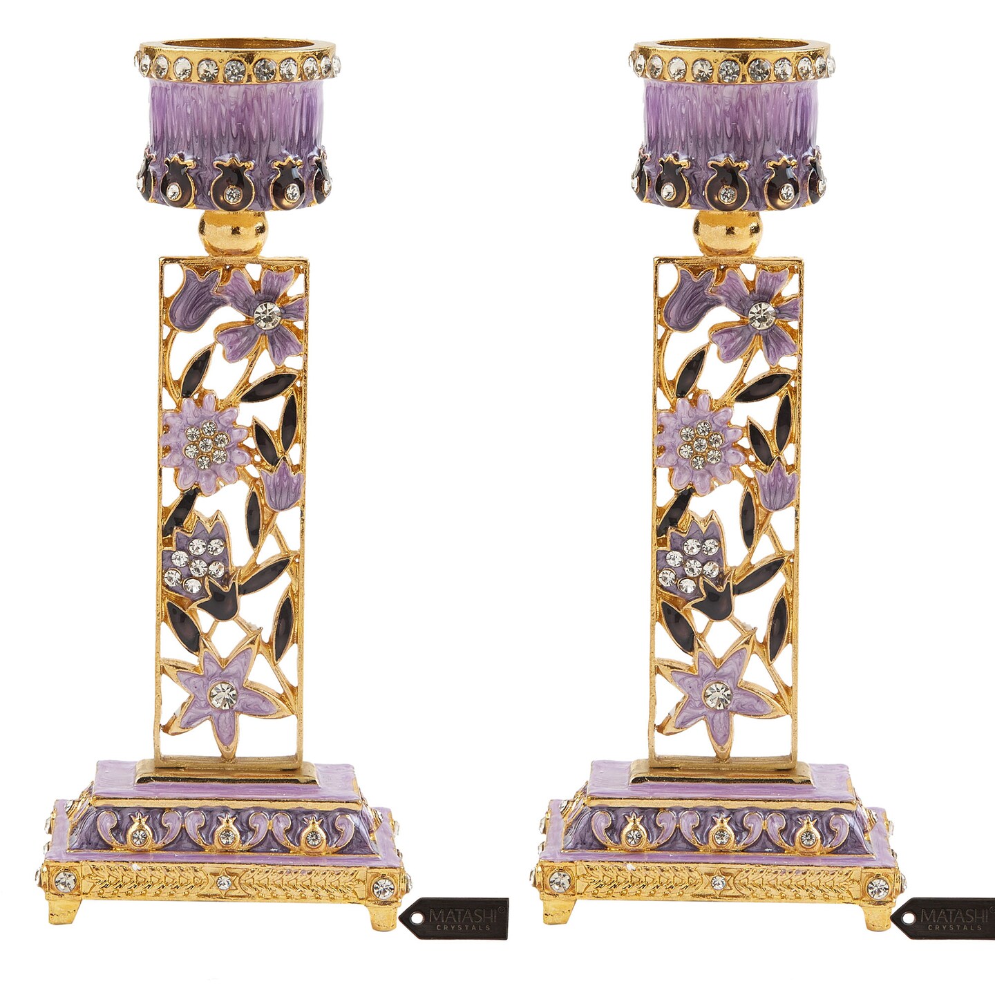 Shabbat Candlestick (2-Piece Set) Hand-Painted Gold-Plated Pewter Adorned W/ Pomegranates And Flowers (Purple) By