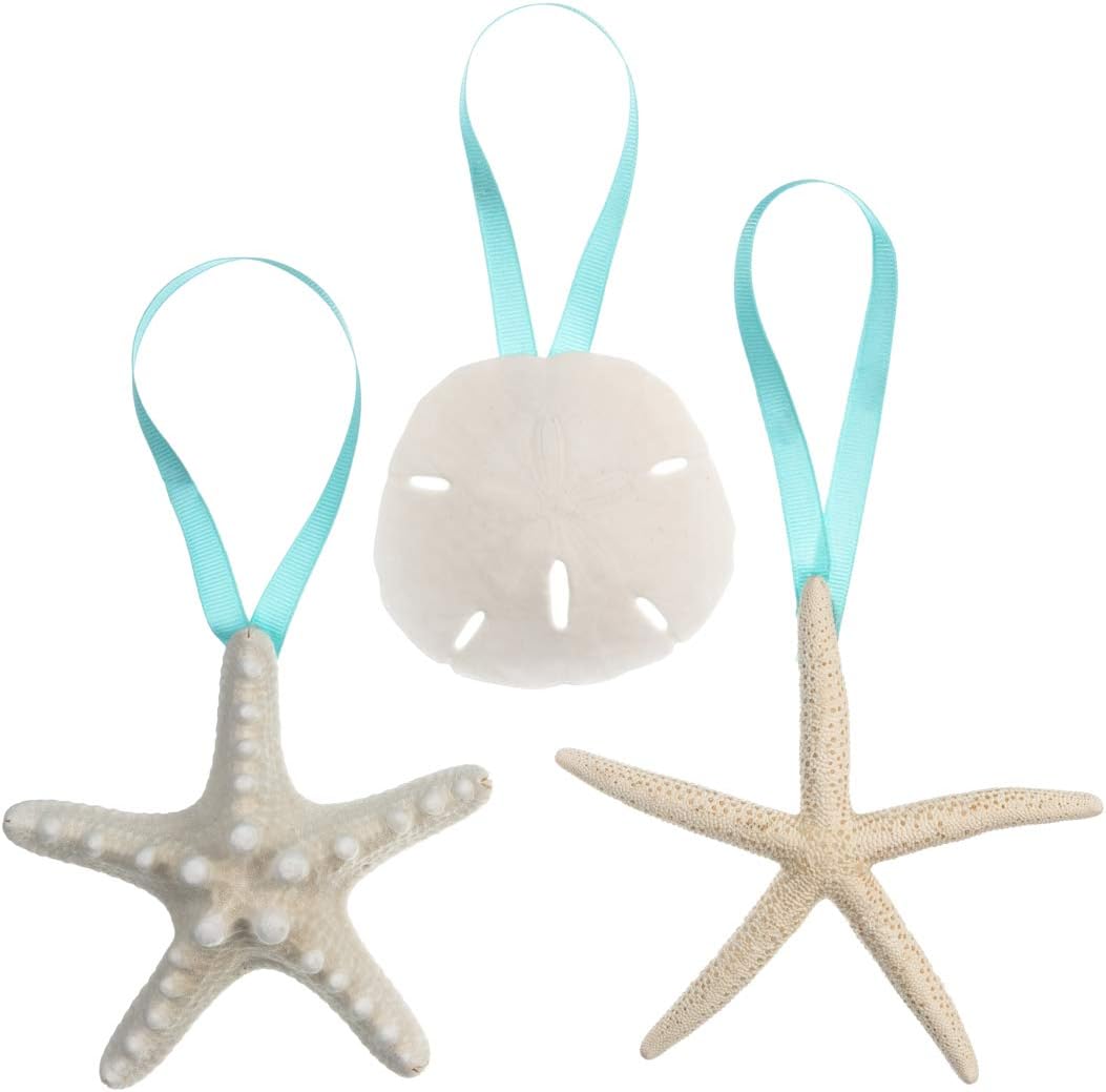 Shell Ornaments Christmas Ornaments for Tree 3 Pack Hanging Knobby Starfish, Finger Starfish and Sand Dollar w/Turquoise Ribbon