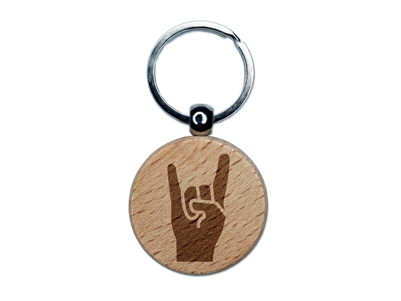 Sign of the Horns Rock and Roll Hand Gesture Engraved Wood Round Keychain Tag Charm