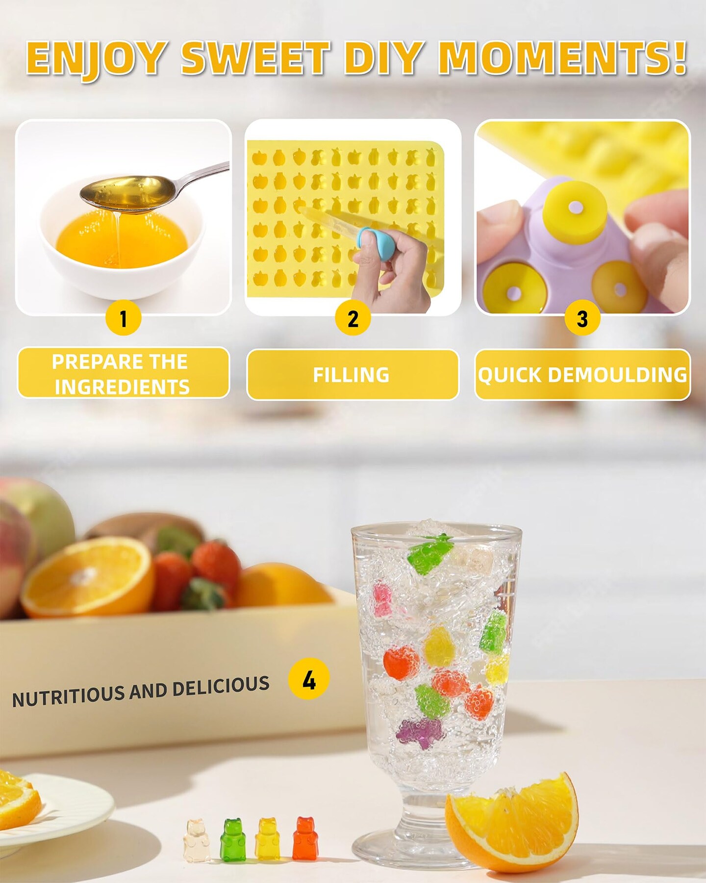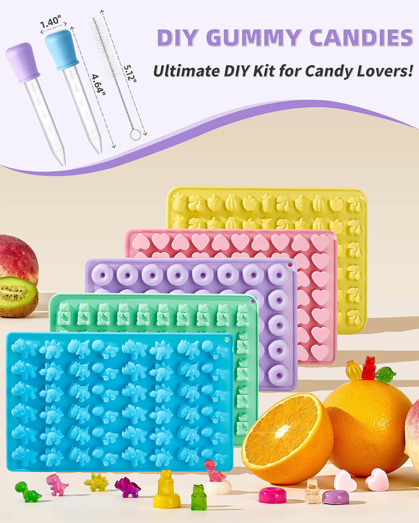 Silicone Gummy Molds Set of 5, Non-stick Candy Chocolate Molds with 2 Droppers 1 Clean Brush, Includes Dinosaur Bear Donut Fruit Heart Shape