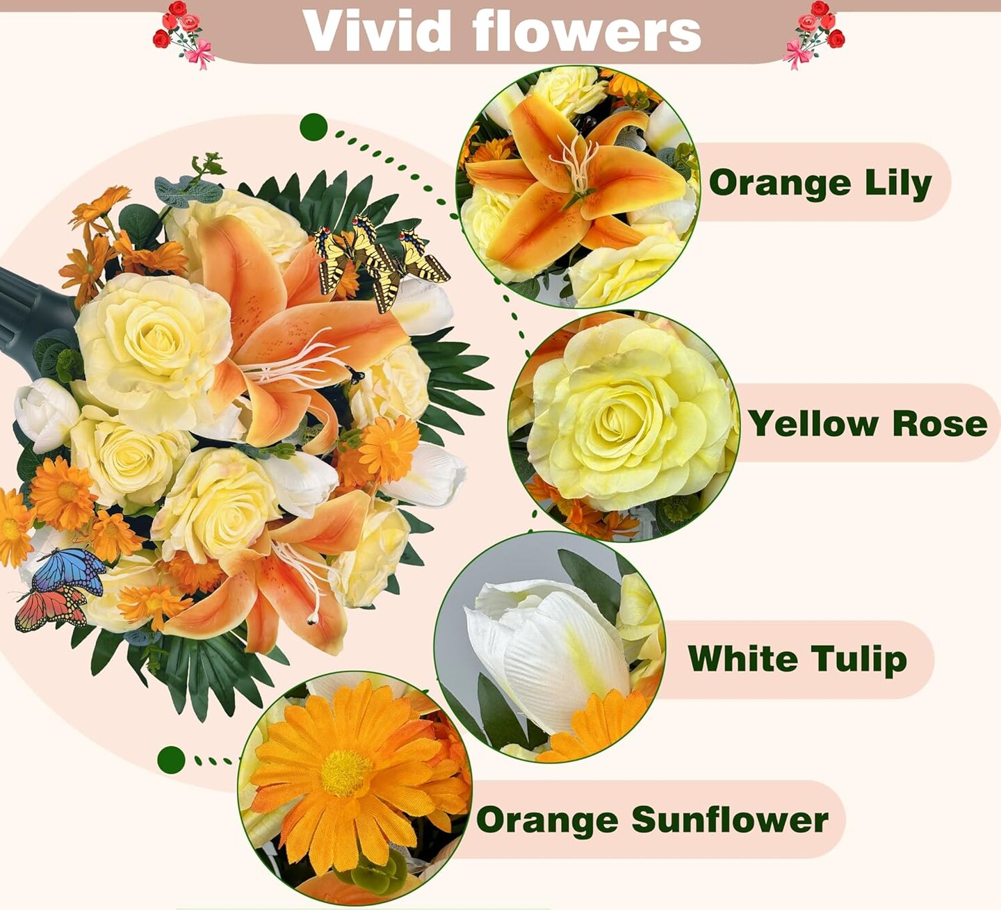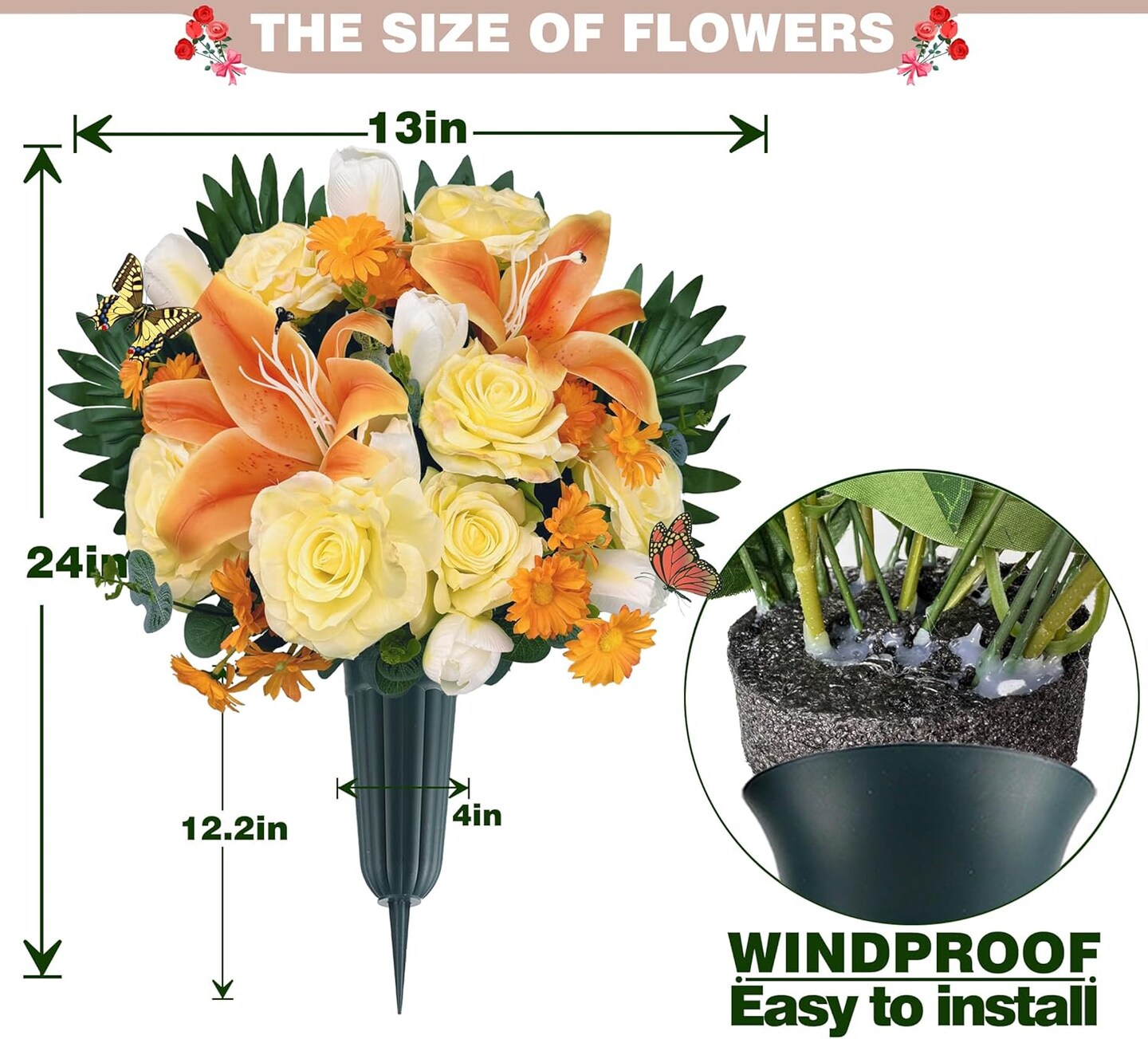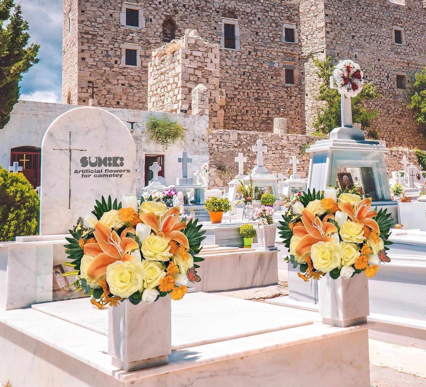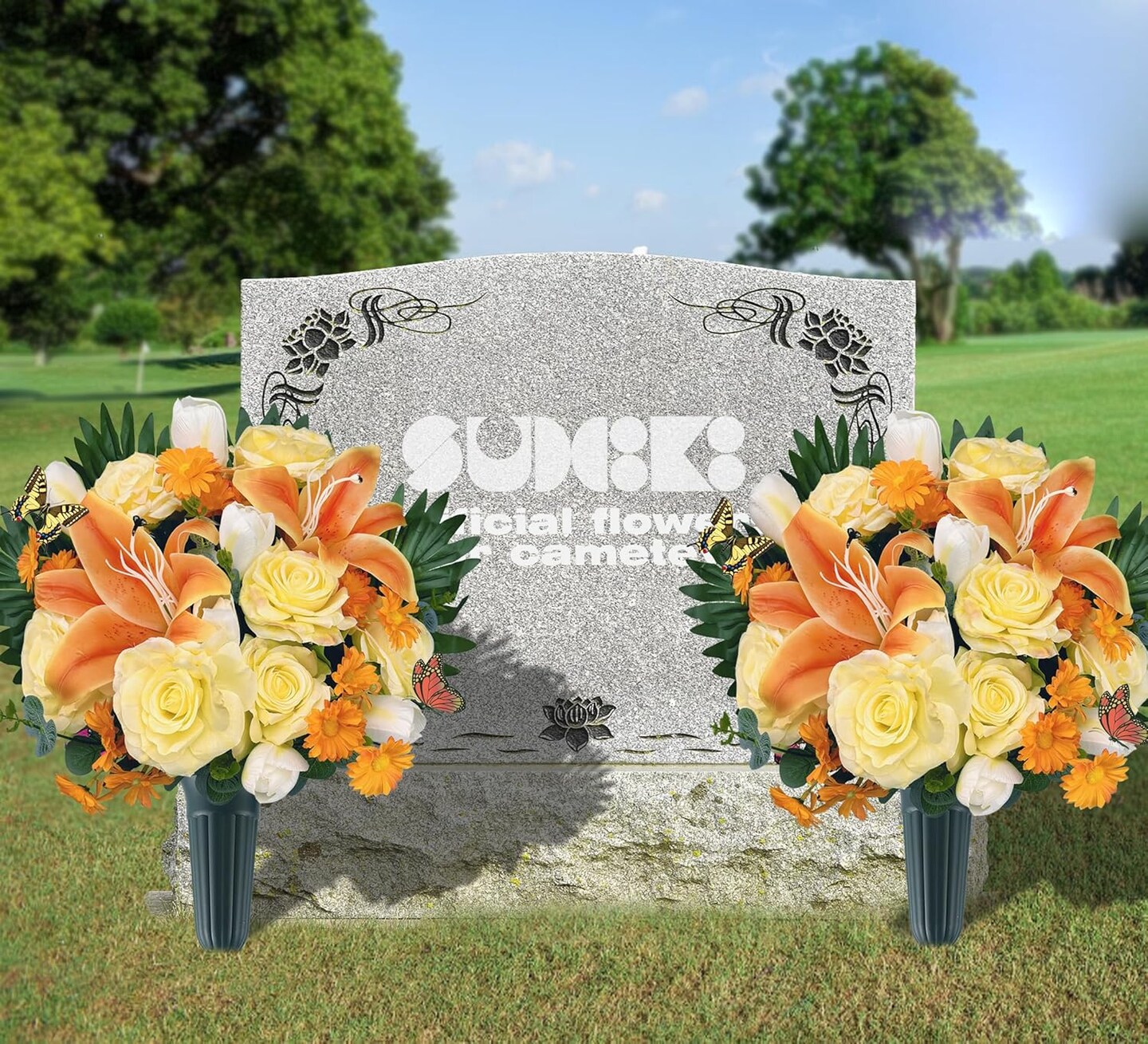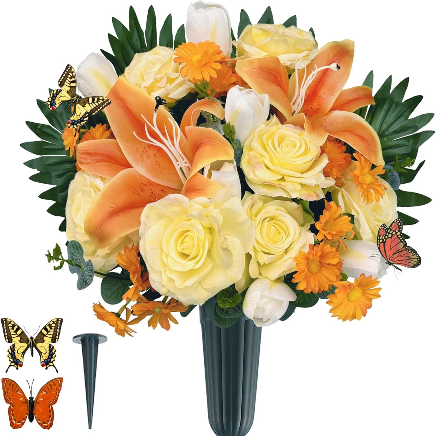 Silk Cemetery Flowers with Vases – Artificial Yellow/White Bouquet for Grave Décor with 2 Butterflies, Ideal for Memorial Day