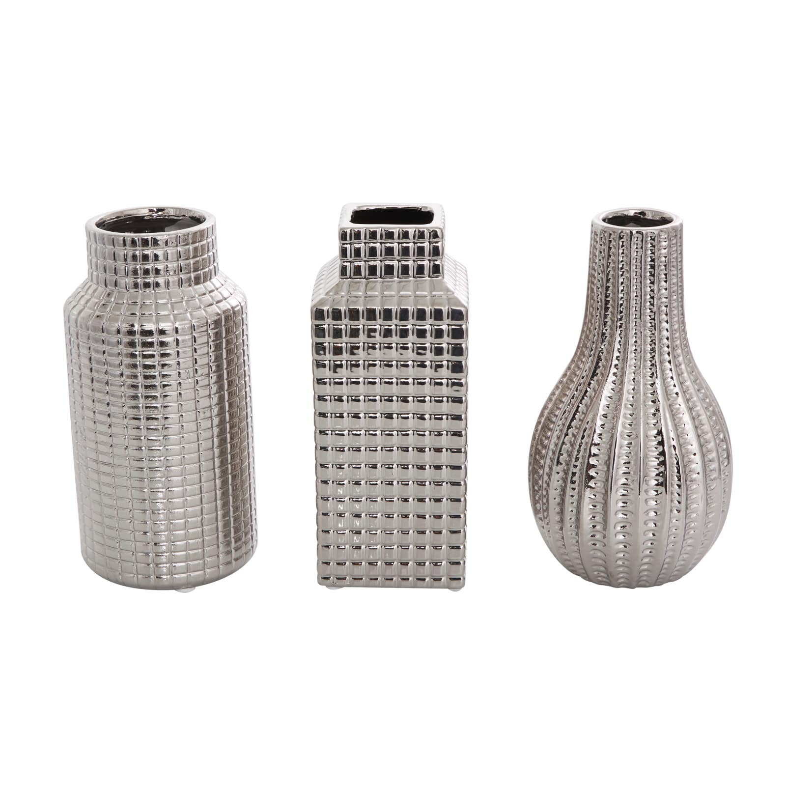 Silver Ceramic Geometric Dimensional Textured Vase Set with Varying Shapes & Grid Patterns