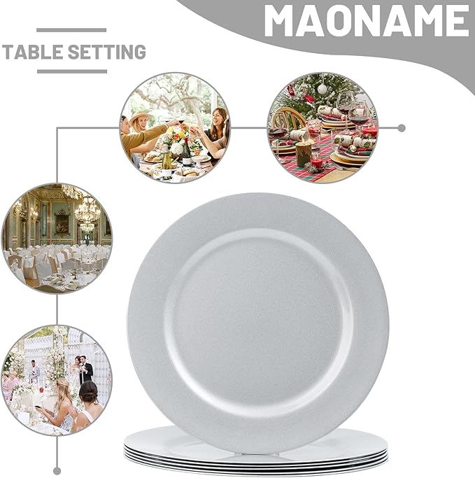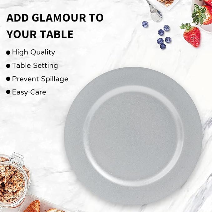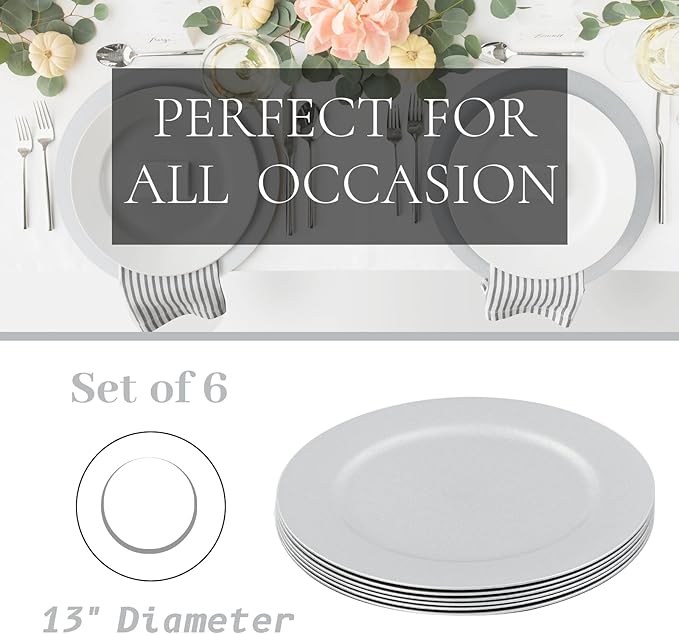 Silver Charger Plates Set of 6, 13-Inch Round Plate Chargers for Dinner Plate, Plastic Table Chargers for Wedding Decor, Party