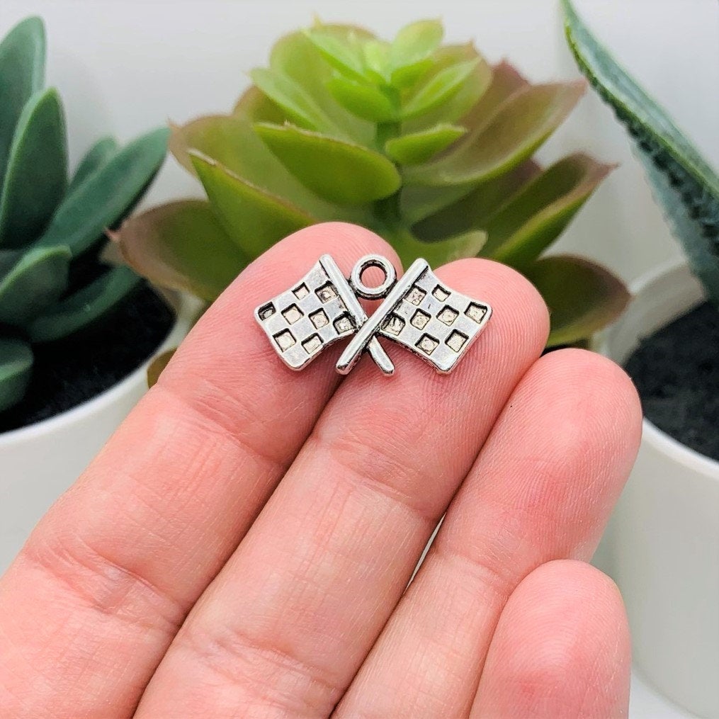 Silver Checkered Flag Racing Charms, 12x22mm
