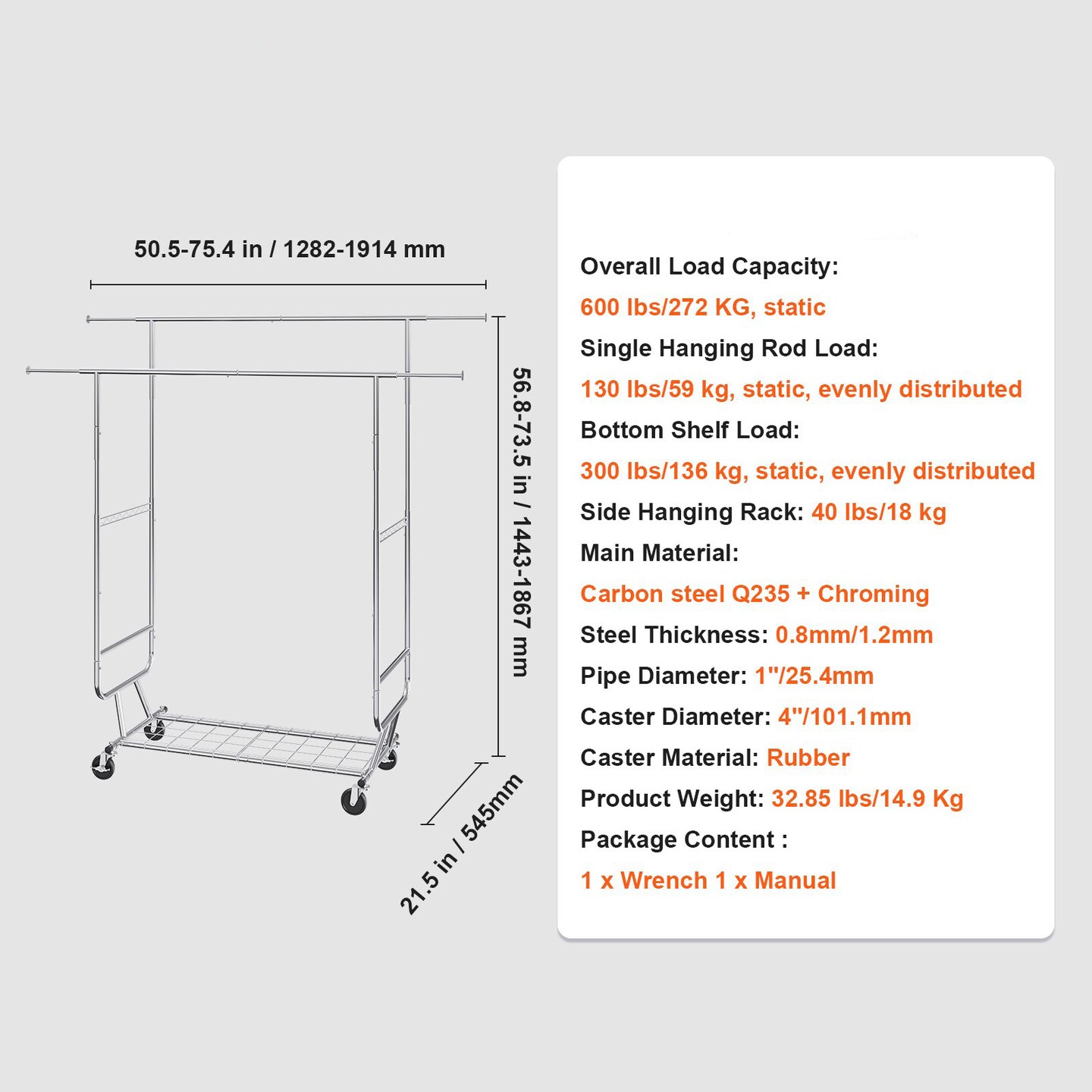Silver Double Rod Garment Rack with Extendable Height, Bottom Shelf and Casters