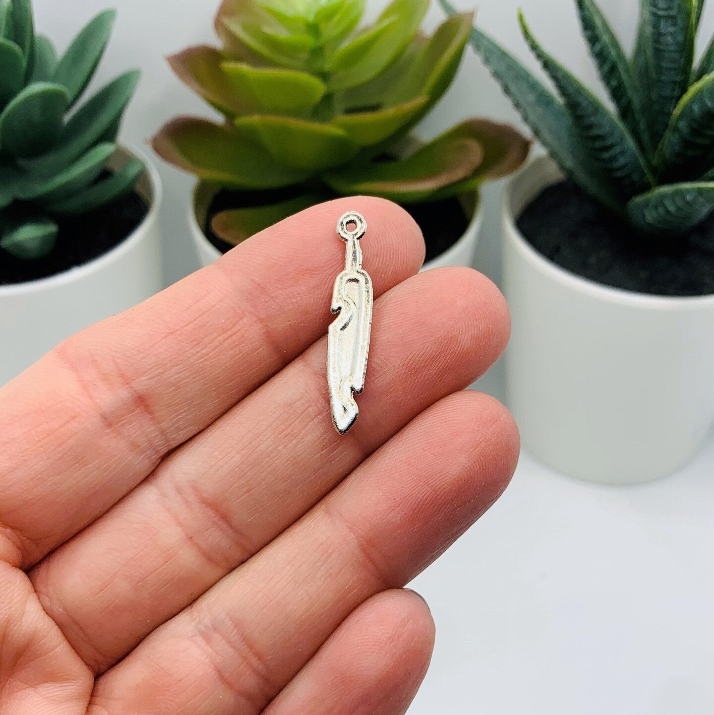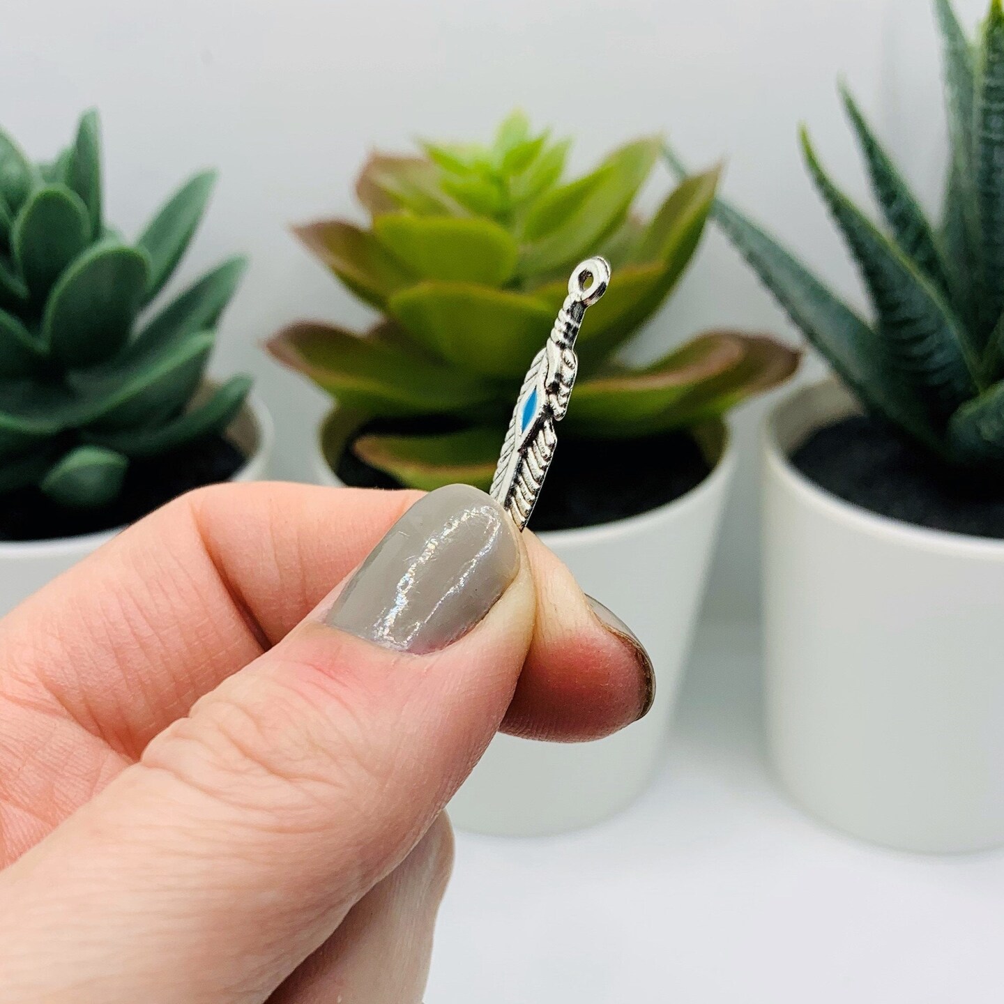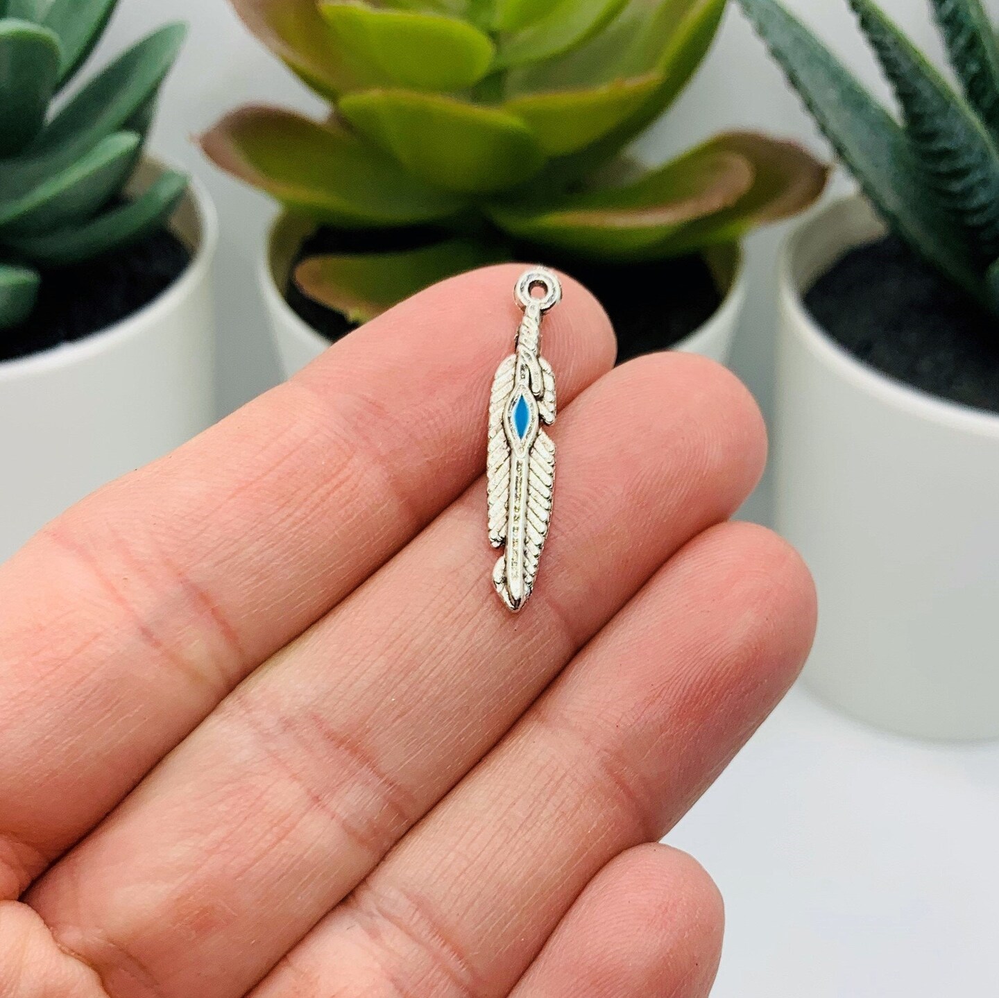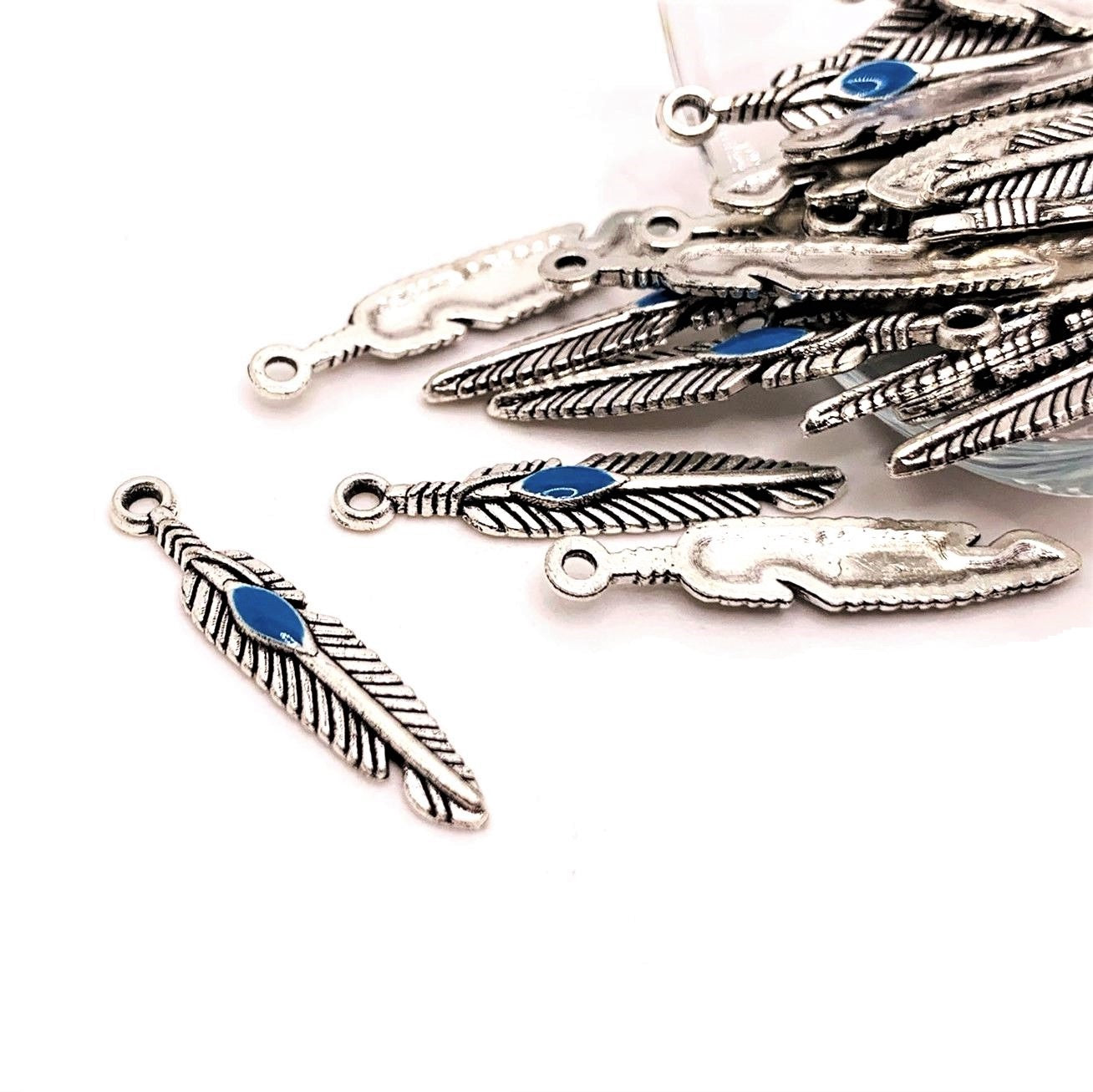 Silver Feather Charms with Blue Center, 28x5mm