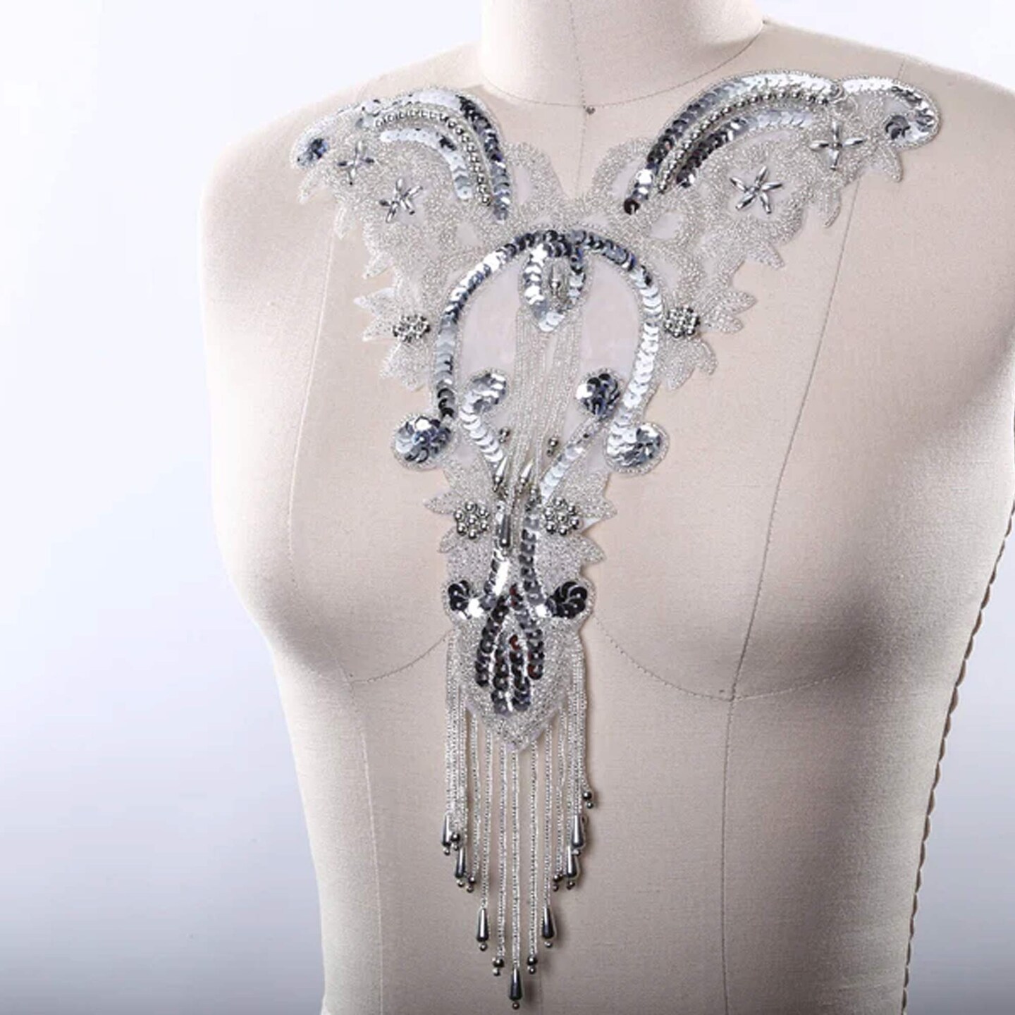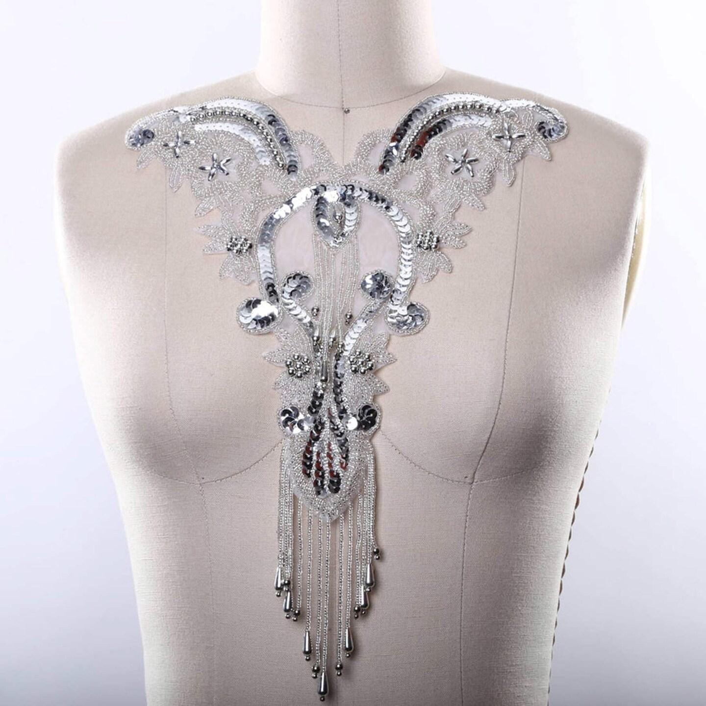 Silver Oversized Beaded Neckline Applique for Gowns Fringe Trim Hot Fix Iron On Patch