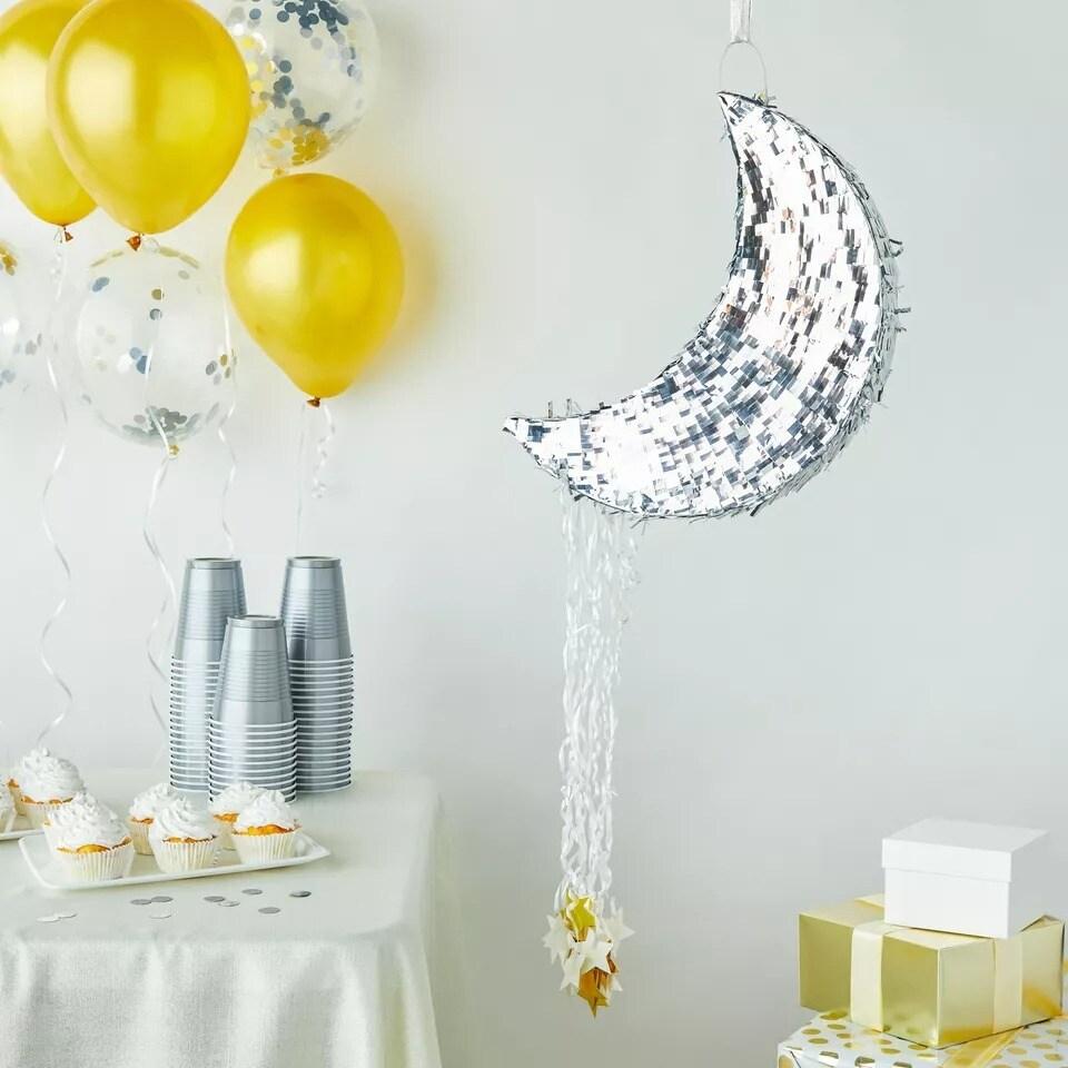 Silver Pull String Crescent Moon Pinata for Birthday, Gender Reveal, 17x11x3