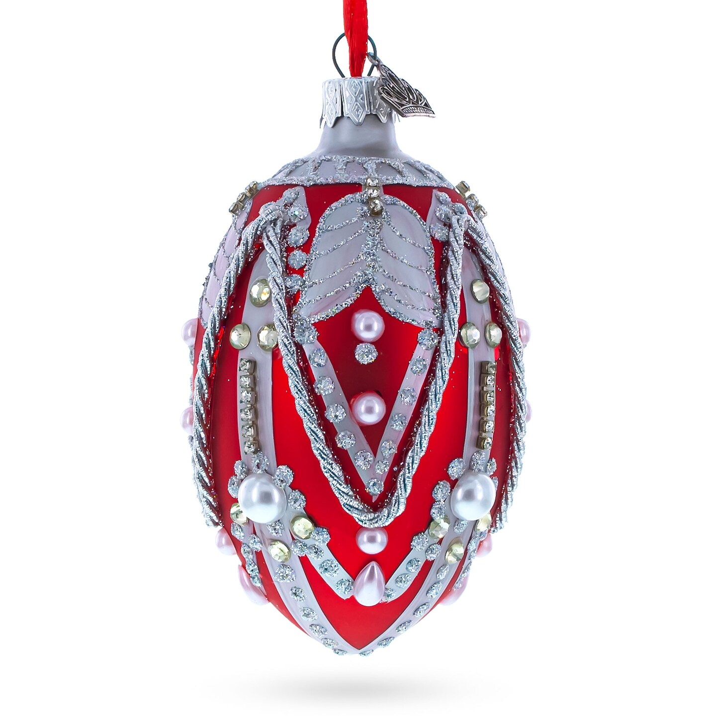 Silver Ropes on Red Glass Egg Christmas Ornament 4 Inches
