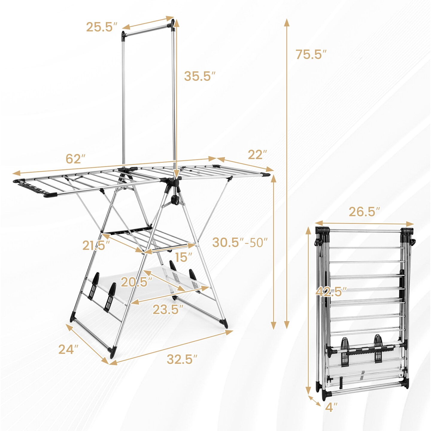 Silver Stainless Steel Folding Drying Rack with Adjustable Height, Side Clips and Shoe Holders
