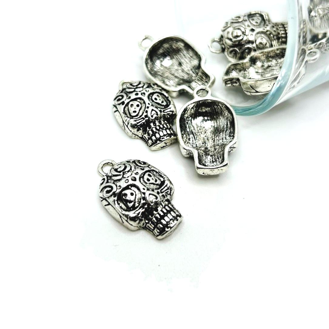 Silver Sugar Skull Dia De Los Muertos 3D Charms, 25x16mm