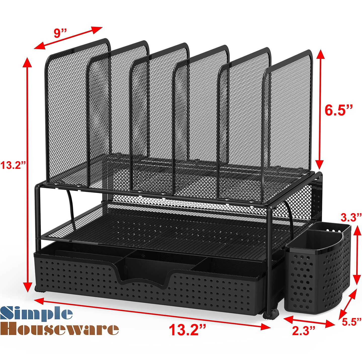 Simple Houseware Mesh Desk Organizer with Sliding Drawer, Double Tray and 5 Upright Sections, Black