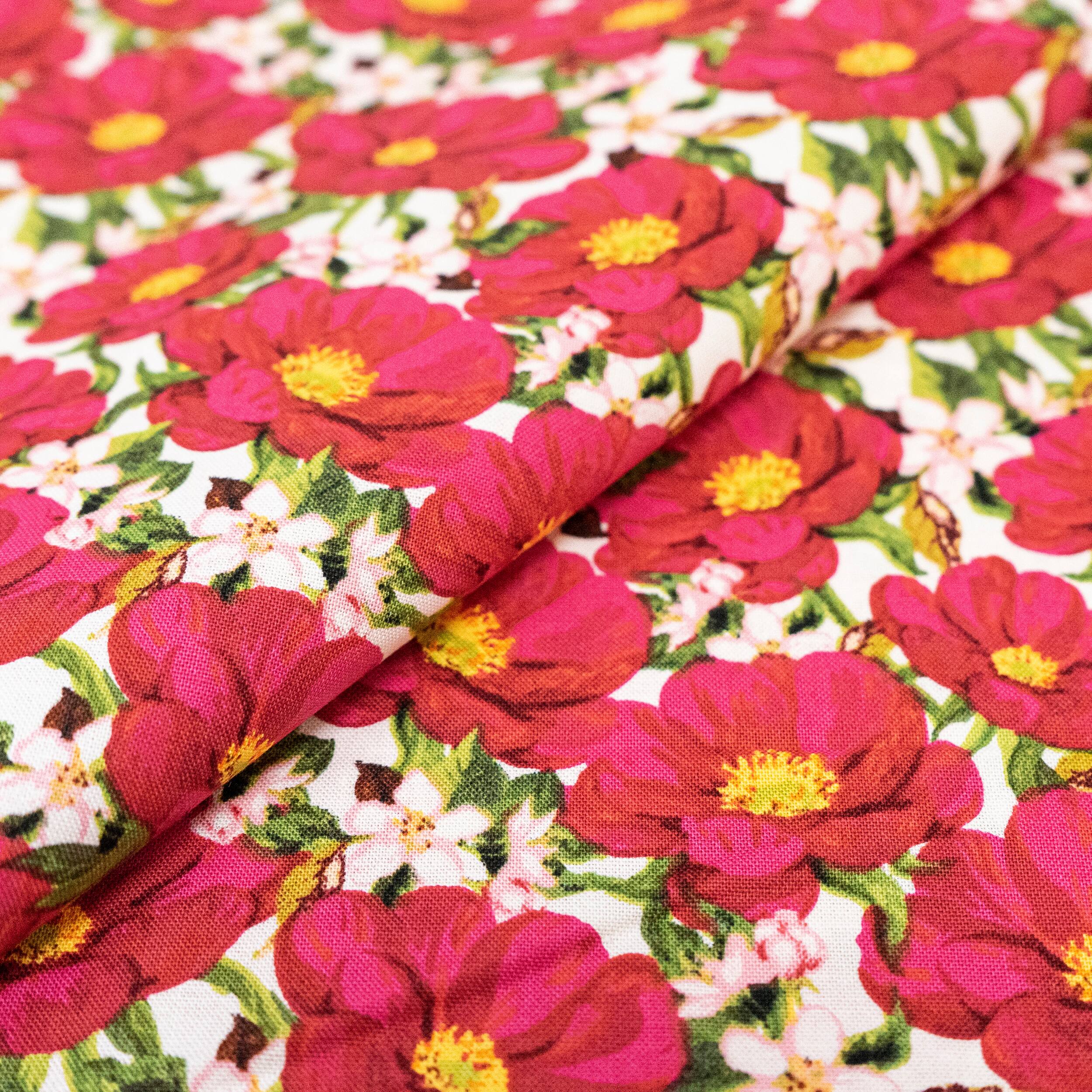 SINGER Pink Flowers on White Cotton Fabric