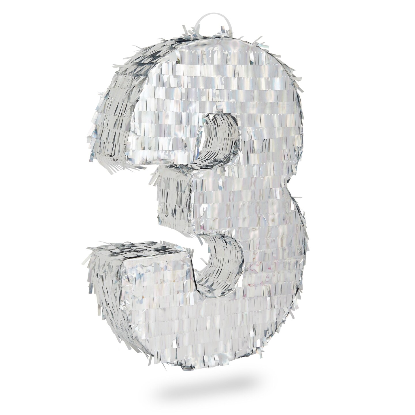 Small Holographic Silver Foil Number 3 Pinata for Kids Birthday Party Decorations (15.7x9x3 in)