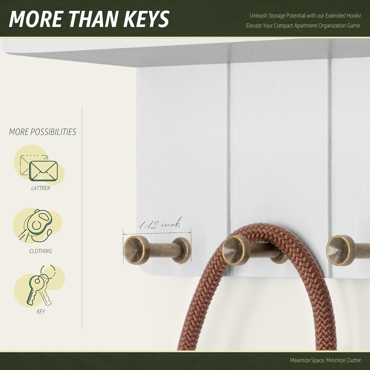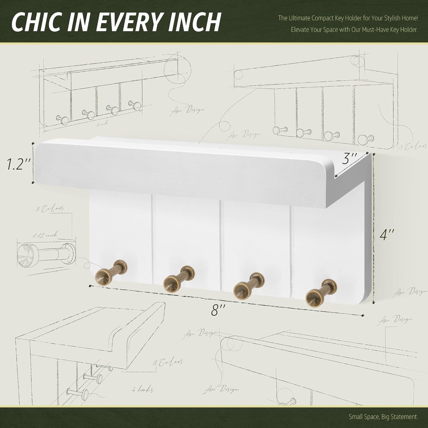 Small Key Holder Wall Mount - Aesthetic Room Decor with 4 Study Hooks and Mini Floating Shelf - Ideal Apartment Essentials for Farmhouse Living Room and Home Decor (Modern White)