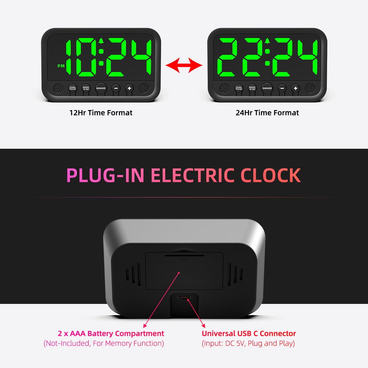 Small LED Digital Clock for Bedroom, Loud Alarm Clock for Heavy Sleepers Adults, Teens | Plug-In Electric Desk Clock | Simple Bedside Nightstand Clock with Adjustable Volume/Brightness/Snooze – Green