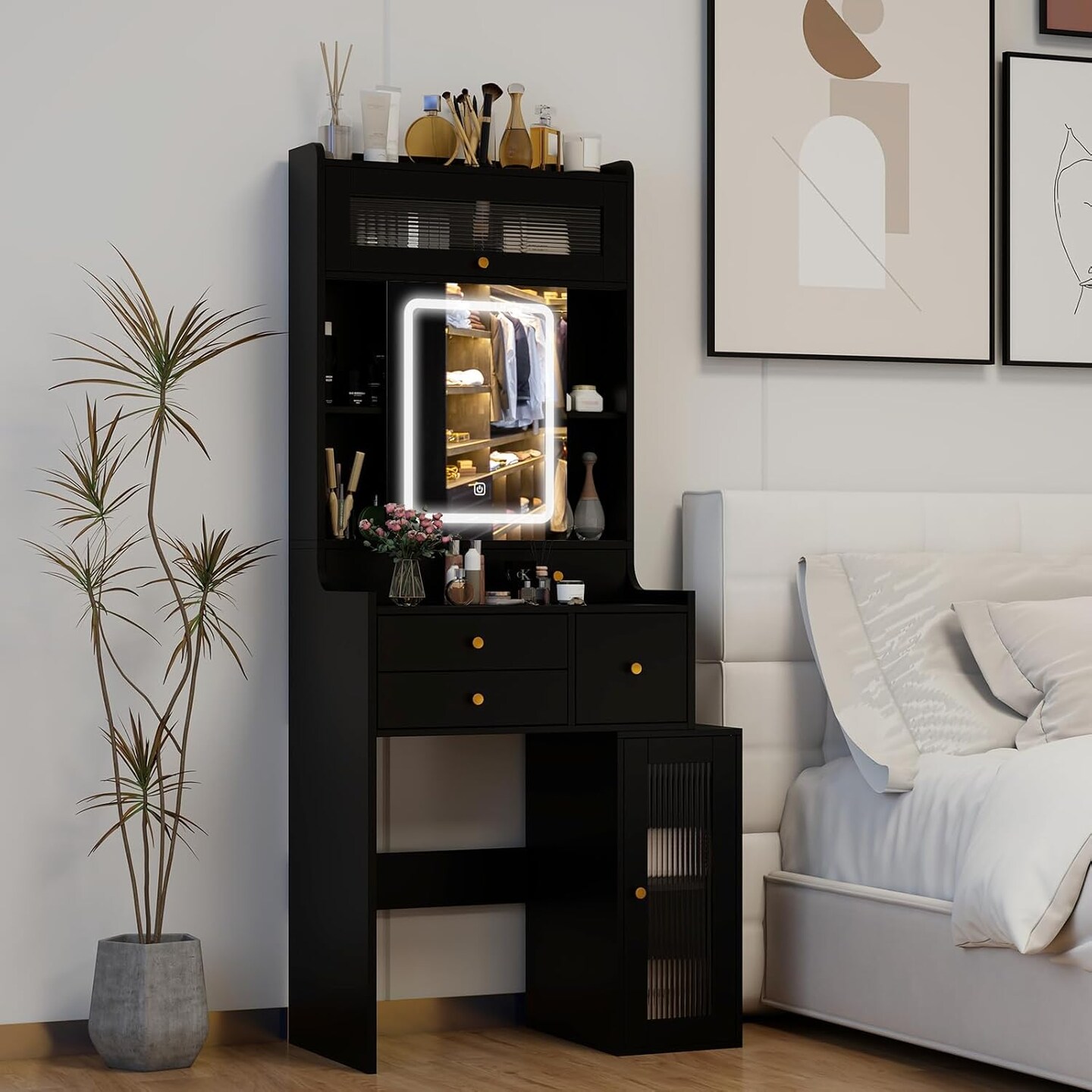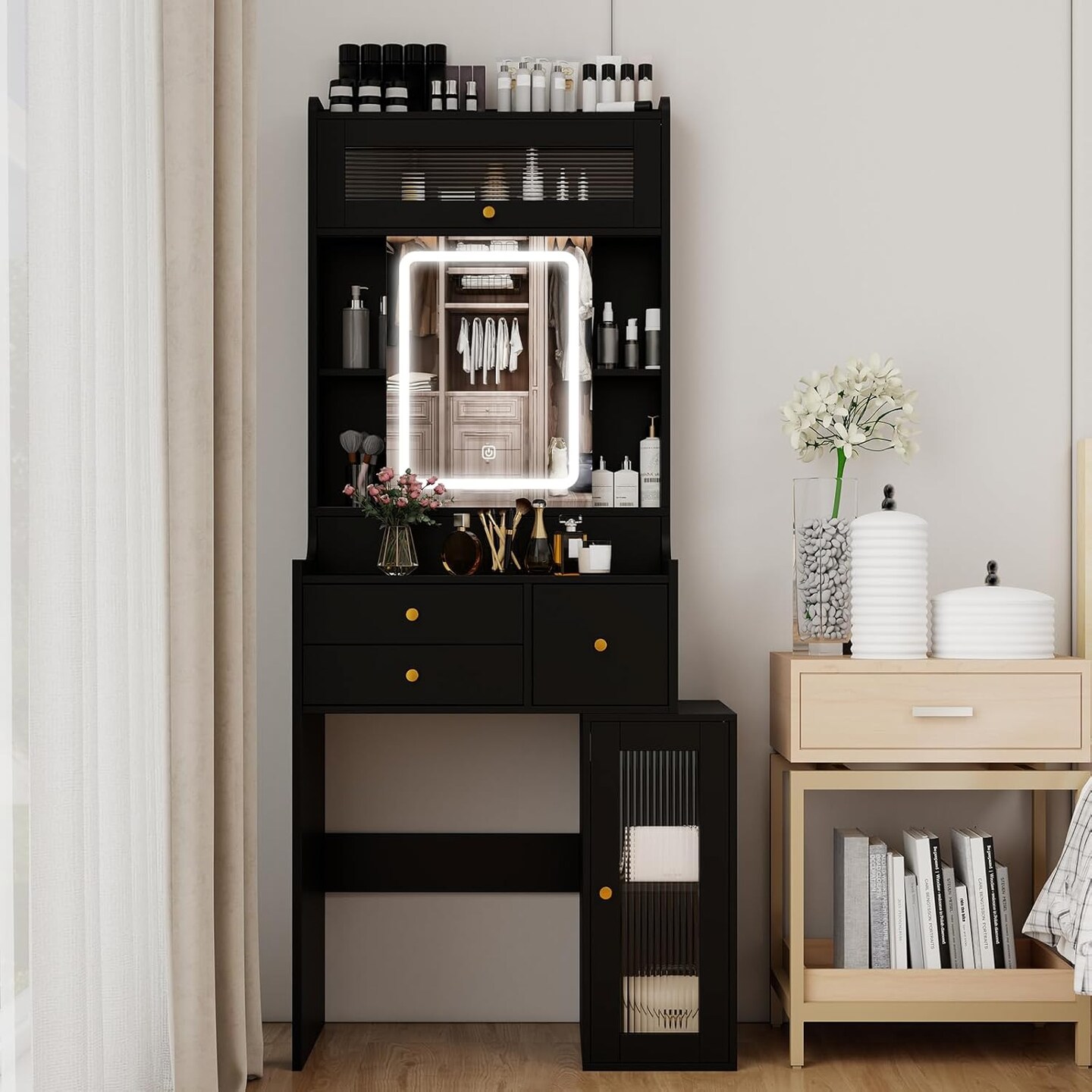 Small Vanity Desk with Sliding Mirror and Lights Black Makeup Vanities Set with Drawers Compact Dressing Table with Cabinet and Adjustable Shelves for Bedroom