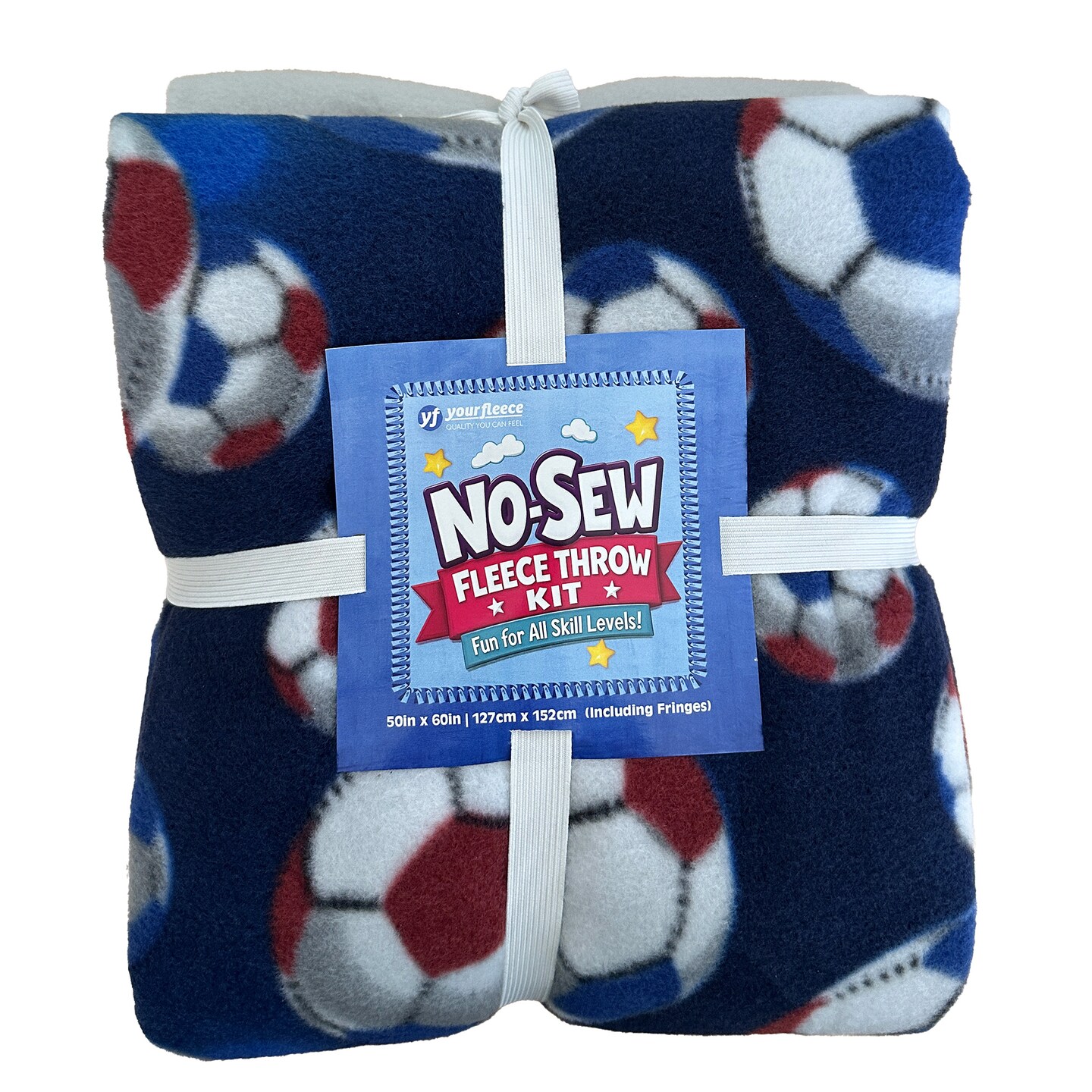 Soccer Balls Navy Anti-Pill Premium No Sew Throw Fleece Fabric Kit (White Backing)