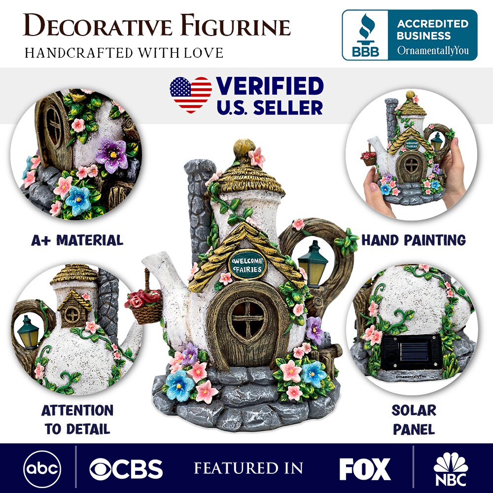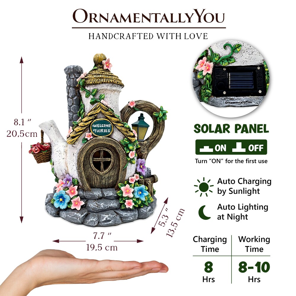 Solar Fairy Tea Pot House Garden Statue, 8 Lighted Mushroom Cottage Figurine Outdoor Decor