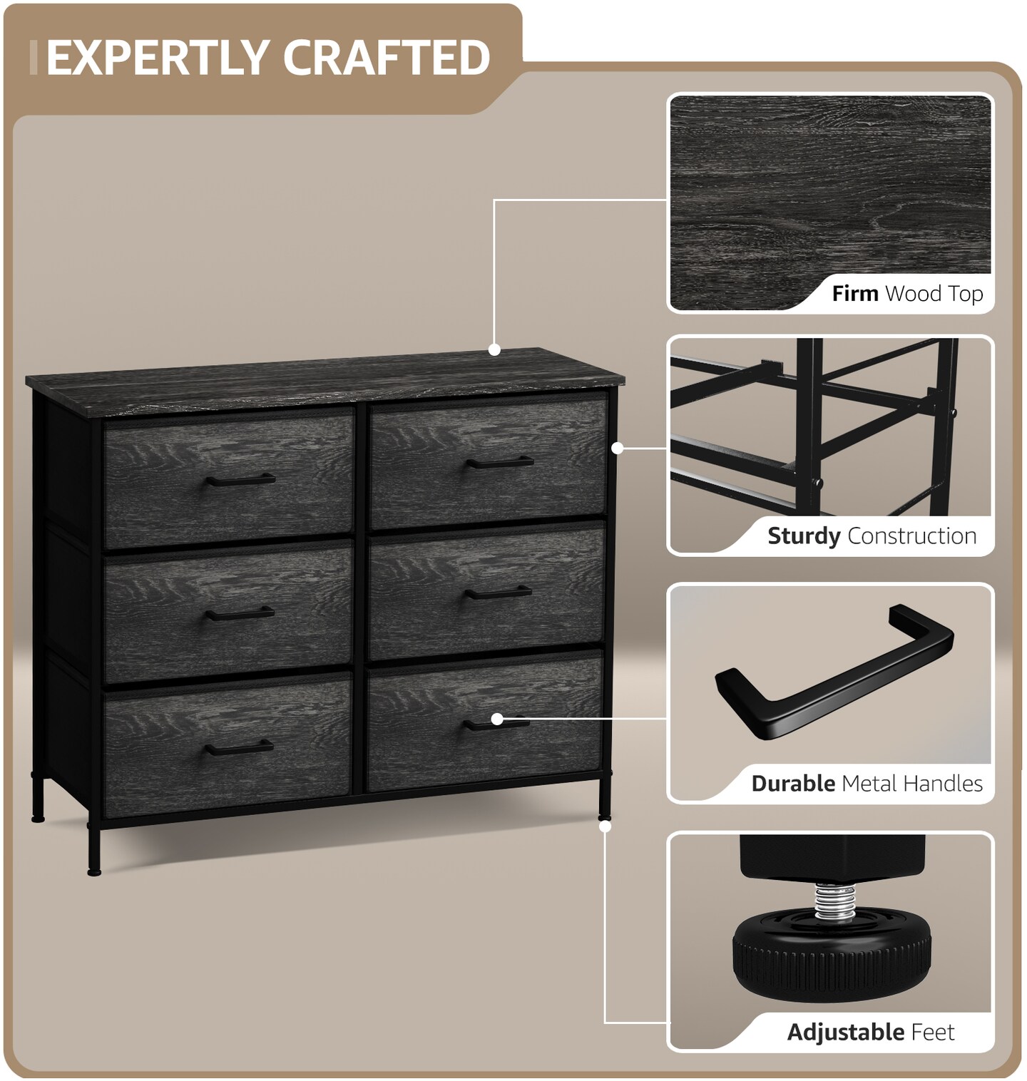 Sorbus 6 Drawers Dresser- Storage Unit with Steel Frame, Wood Top, Fabric Bins - for Bedroom, Closet, Office and more